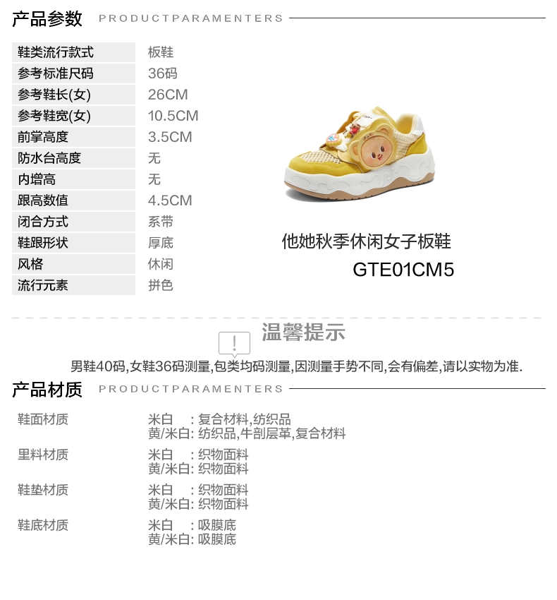 | 鞋跟形状:厚底 | 参考鞋长(女):26CM | 流行元素:拼色 | 参考鞋宽(女):10.5CM | 风格:休闲 |