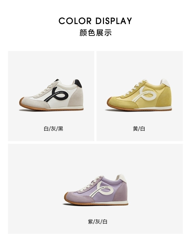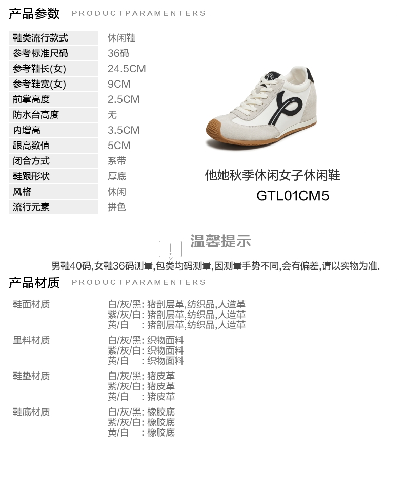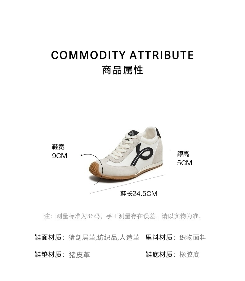 | 鞋帮:低帮 | 鞋底材质:橡胶底 | 内增高:3.5CM | 鞋面材质:猪剖层革人造革纺织品 | 闭合方式:系带 |