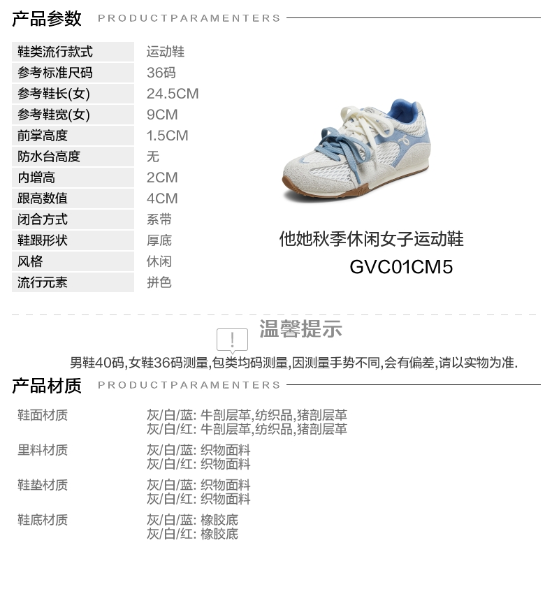 | 鞋跟形状:厚底 | 参考鞋长(女):24.5CM | 流行元素:拼色 | 参考鞋宽(女):9CM | 风格:休闲 |