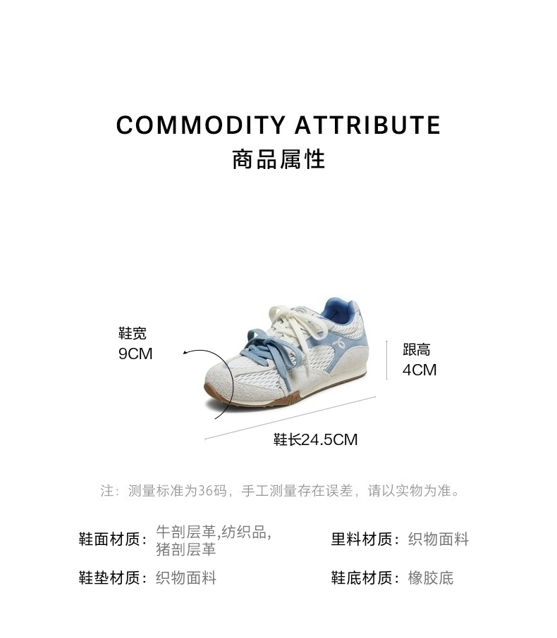 | 鞋帮:低帮 | 鞋底材质:橡胶底 | 内增高:2CM | 鞋面材质:猪剖层革纺织品牛剖层革 | 闭合方式:系带 |