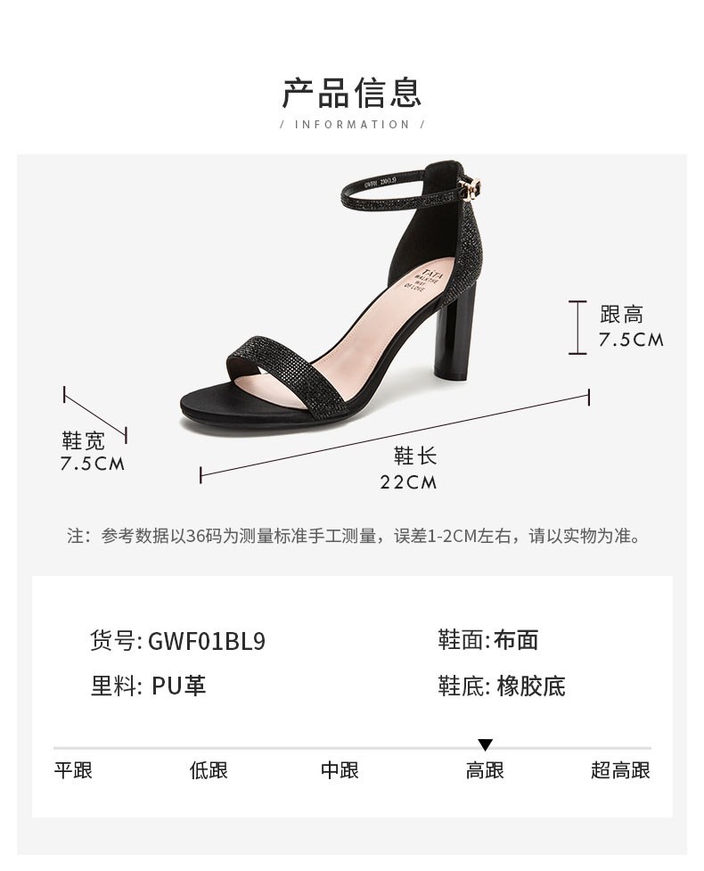 | 鞋头款式:露趾 | 鞋底材质:橡胶底 | 鞋面图案:纯色 | 鞋跟形状:细跟 | 鞋面材质:布面 |