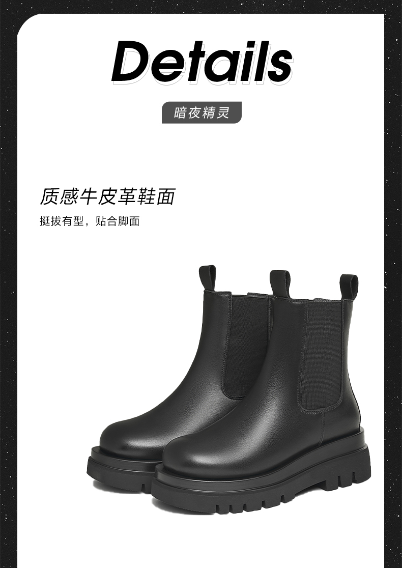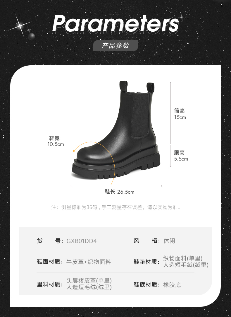 | 帮面材质:织物牛皮革 | 配跟:有 | 靴筒口围:24.5CM | 上市时间:2024年冬季 | 鞋类流行款式:切尔西靴 |
