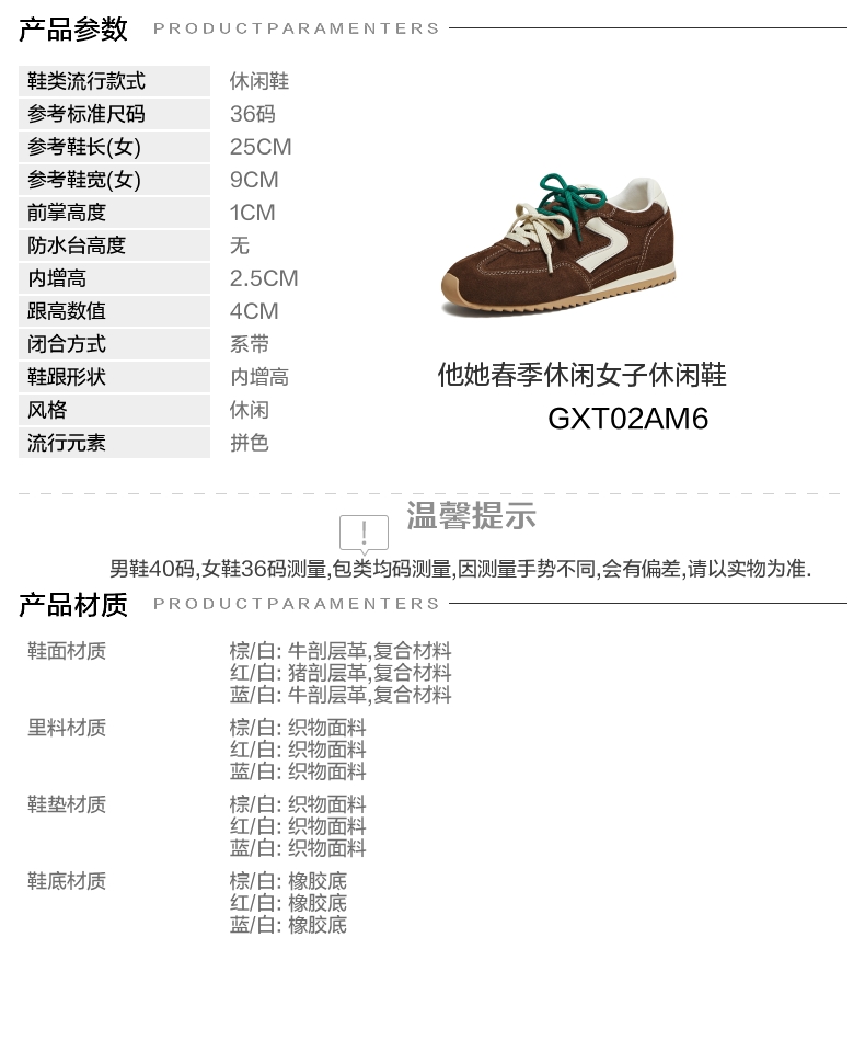 | 鞋跟形状:内增高 | 参考鞋长(女):25CM | 流行元素:拼色 | 参考鞋宽(女):9CM | 风格:休闲 |