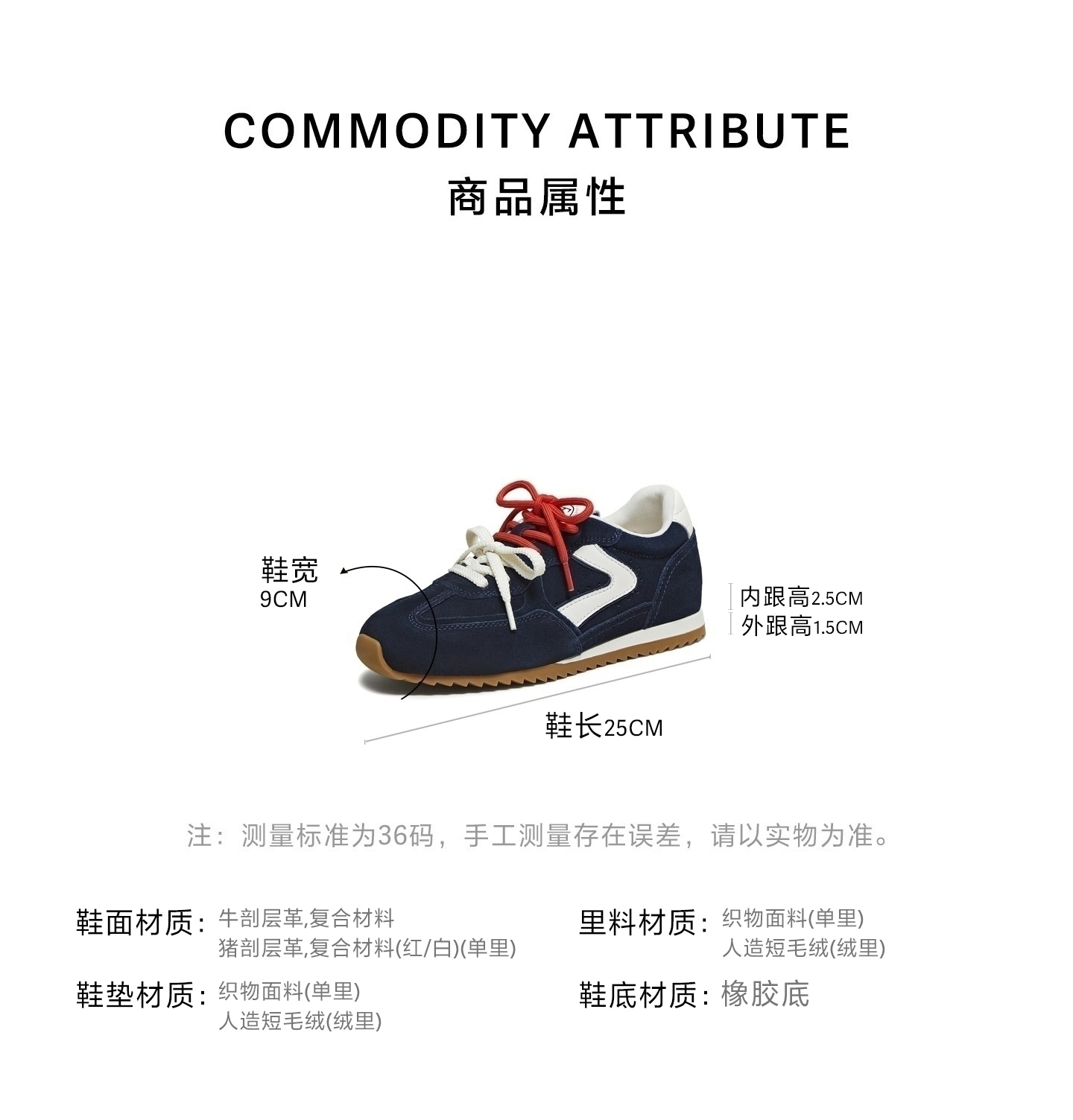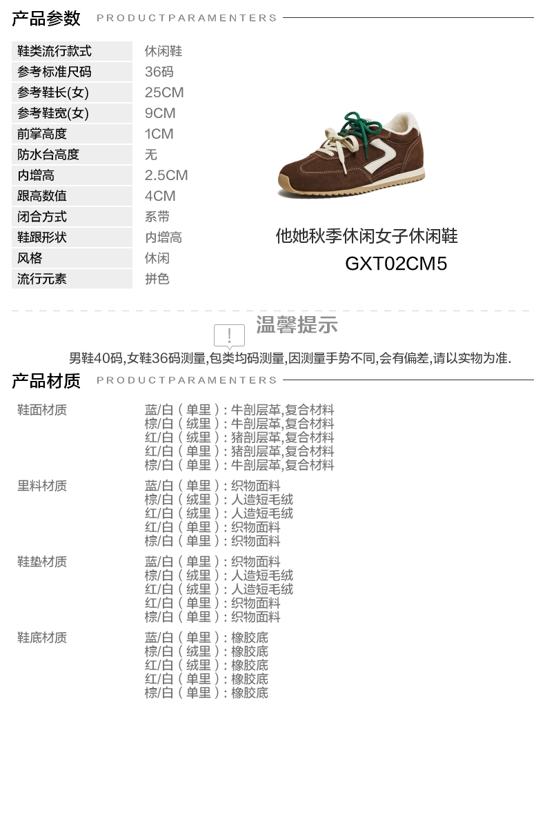 | 鞋跟形状:内增高 | 参考鞋长(女):25CM | 流行元素:拼色 | 参考鞋宽(女):9CM | 风格:休闲 |