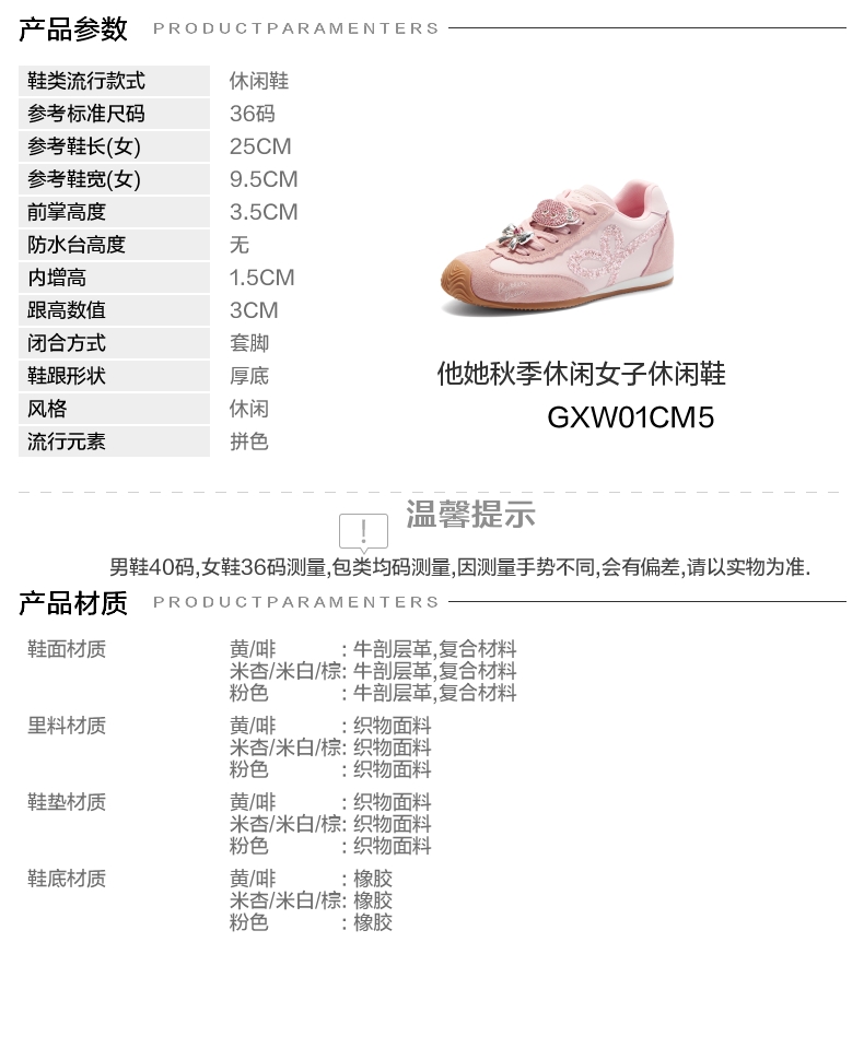 | 鞋跟形状:厚底 | 参考鞋长(女):25CM | 流行元素:拼色 | 参考鞋宽(女):9.5CM | 风格:休闲 |