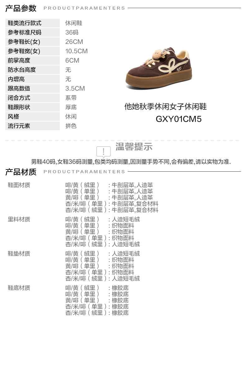 | 鞋跟形状:厚底 | 参考鞋长(女):26CM | 流行元素:拼色 | 参考鞋宽(女):10.5CM | 风格:休闲 |