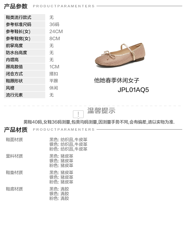 | 参考标准尺码:36码 | 跟高数值:1CM | 性别:女子 | 里料材质:猪皮革 | 制鞋工艺:胶贴皮鞋 |