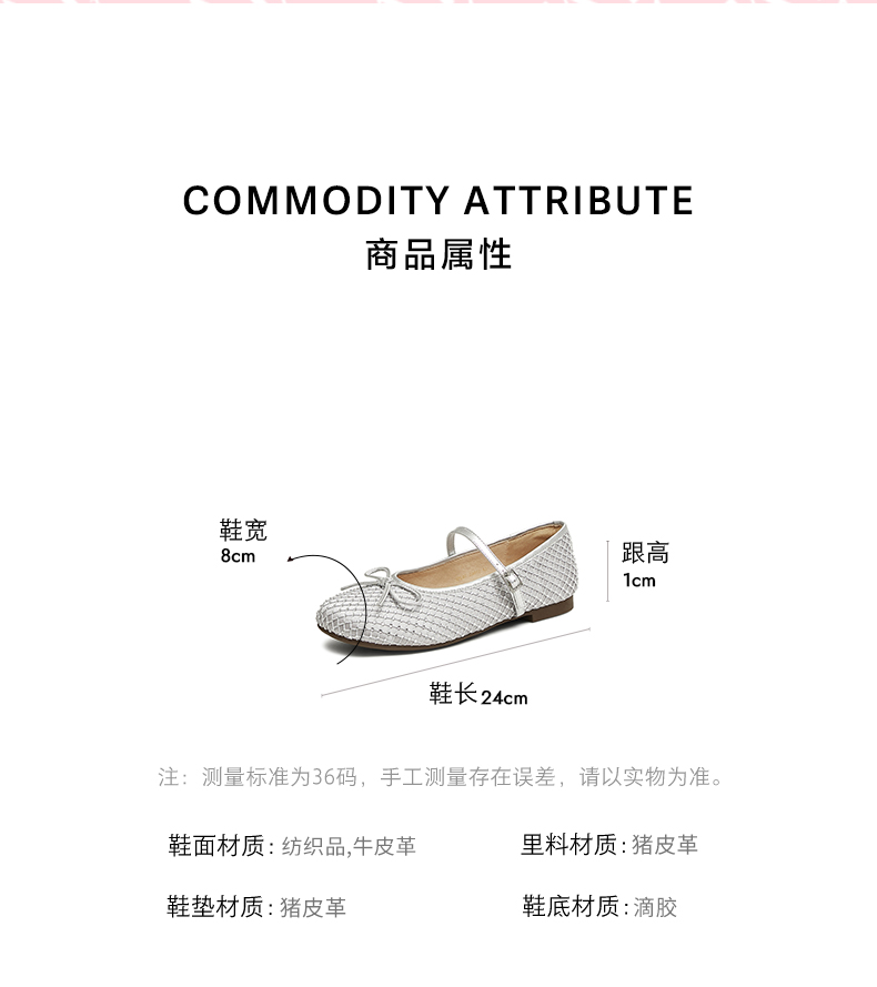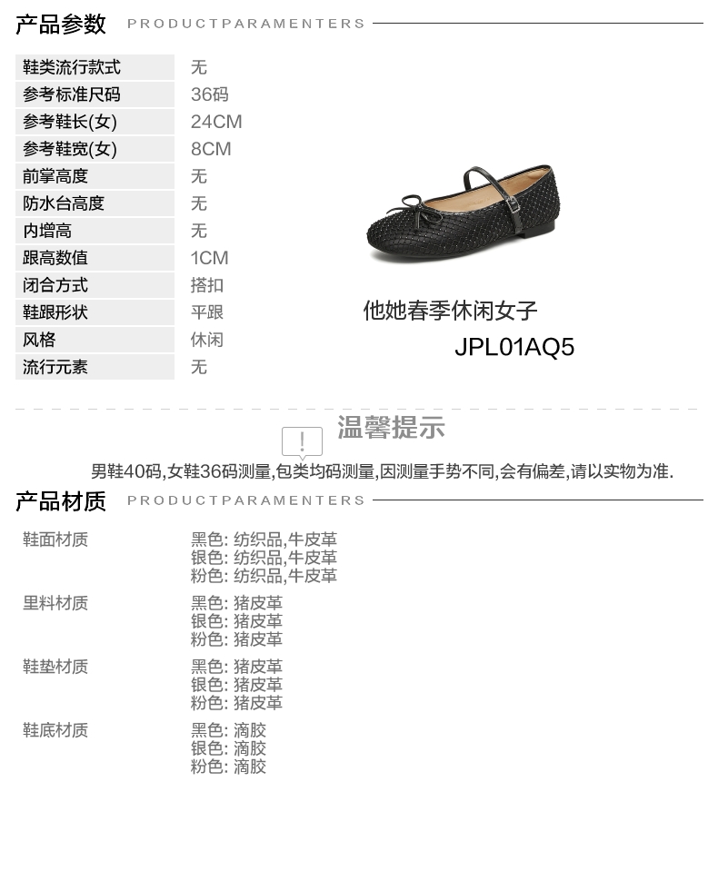 | 参考标准尺码:36码 | 跟高数值:1CM | 性别:女子 | 里料材质:猪皮革 | 制鞋工艺:胶贴皮鞋 |