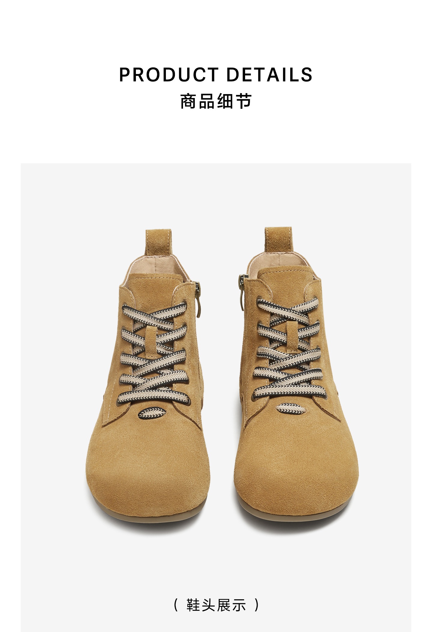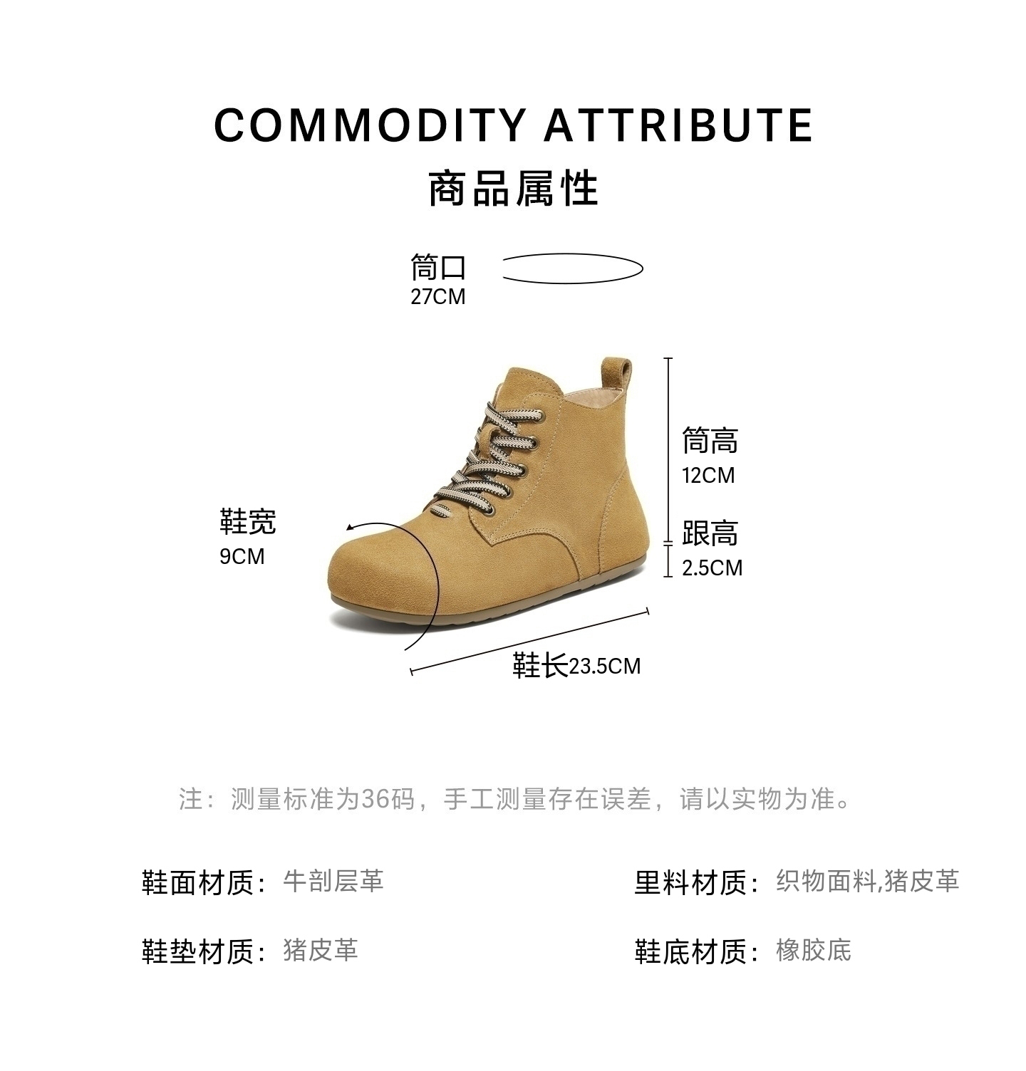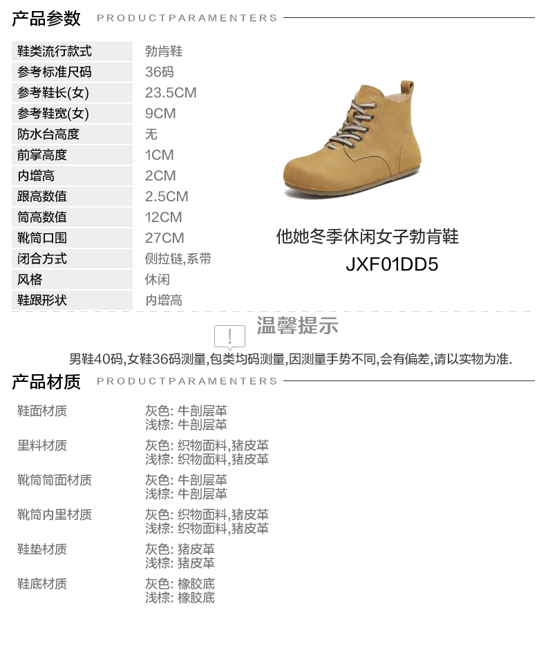 | 鞋底材质:橡胶底 | 靴筒内里材质:猪皮革织物面料 | 内增高:2CM | 鞋面材质:牛剖层革 | 闭合方式:系带侧拉链 |
