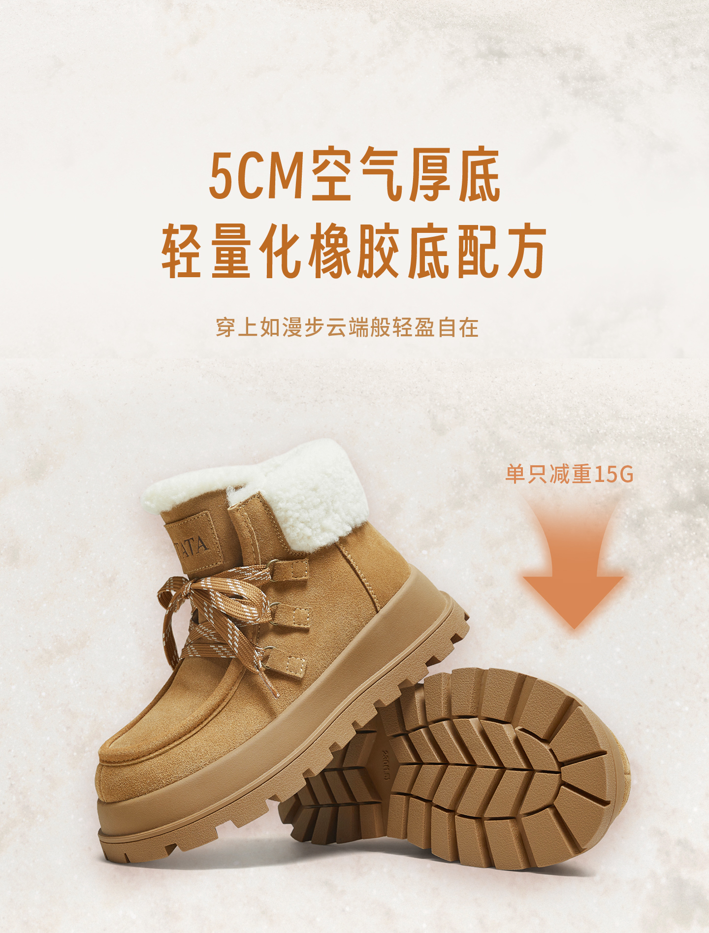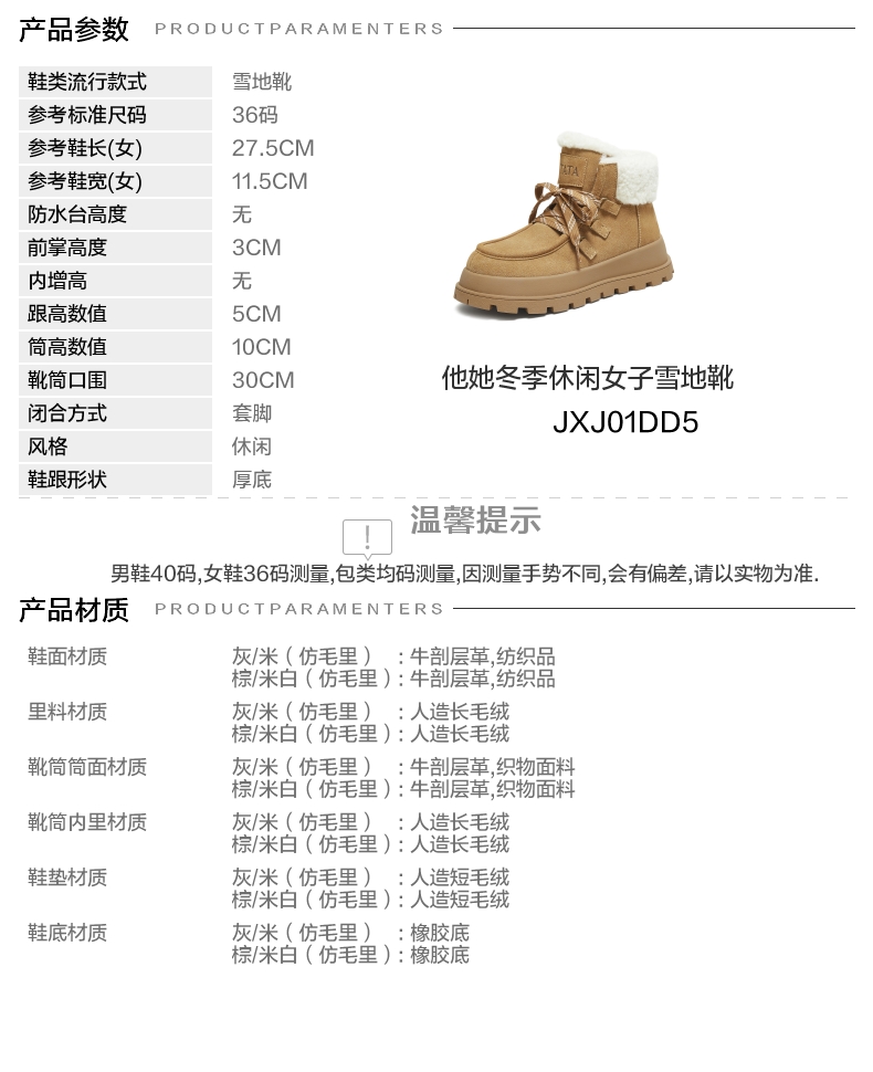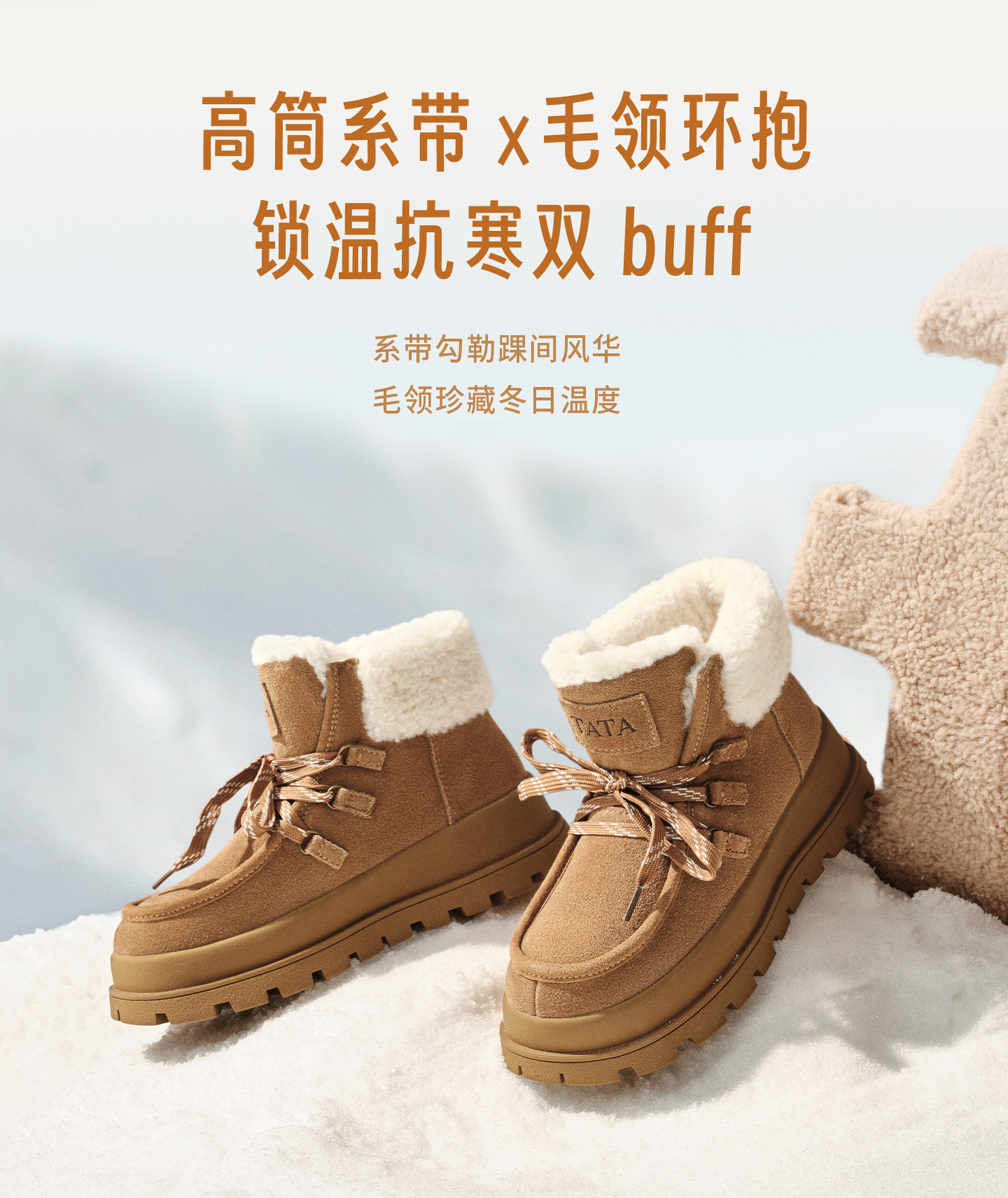 | 帮面材质:织物牛剖层革 | 配跟:无 | 靴筒口围:30CM | 上市时间:2025年冬季 | 鞋类流行款式:雪地靴 |