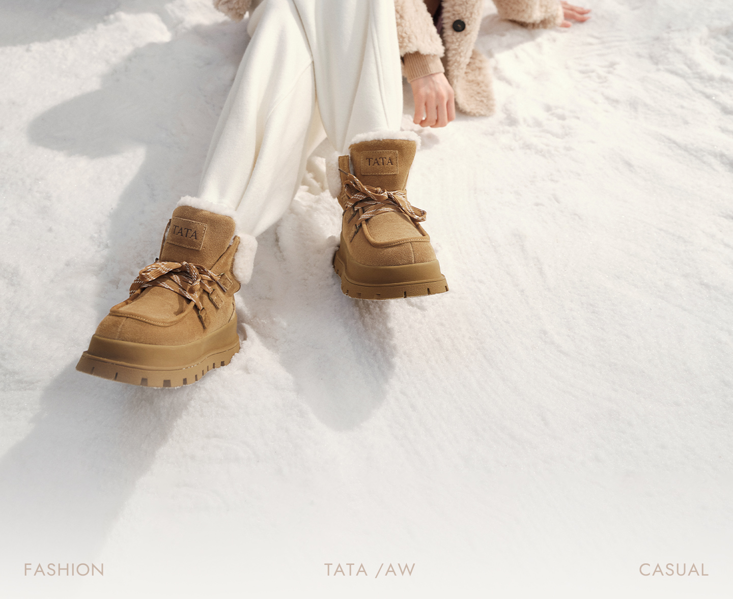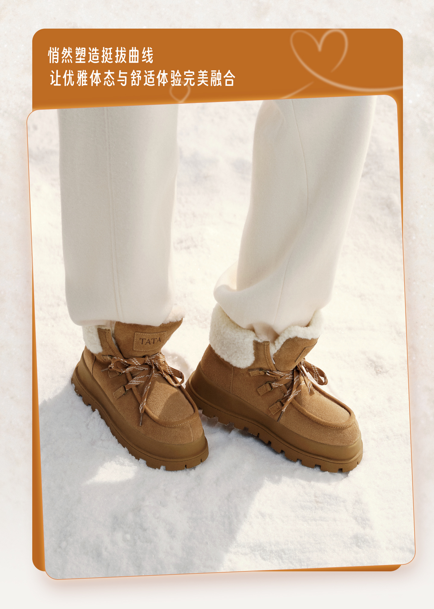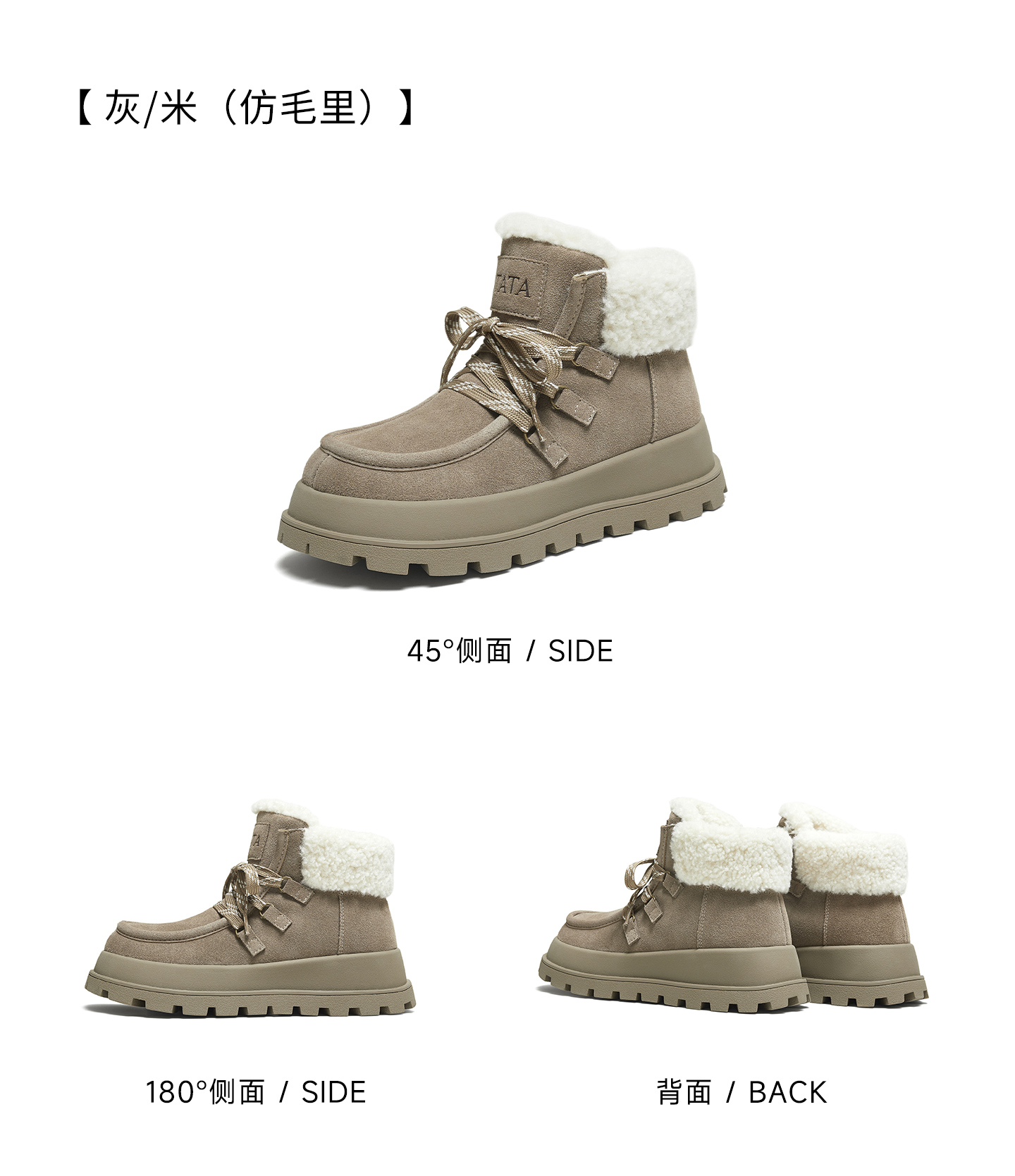 | 帮面材质:织物牛剖层革 | 配跟:无 | 靴筒口围:30CM | 上市时间:2025年冬季 | 鞋类流行款式:雪地靴 |
