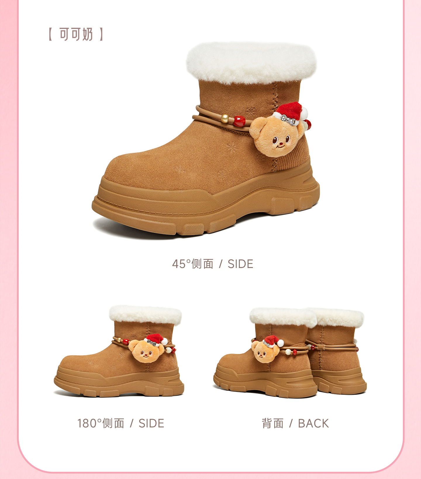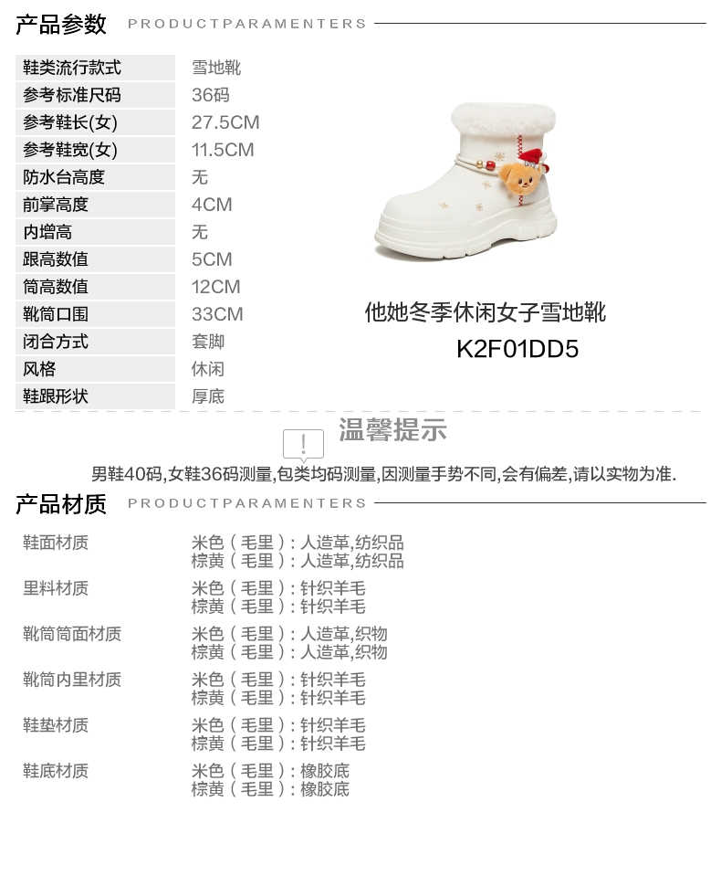 | 帮面材质:织物人造革 | 配跟:有 | 靴筒口围:33CM | 上市时间:2025年冬季 | 鞋类流行款式:雪地靴 |