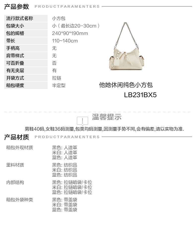 | 包的规格:240*90*190mm | 内部结构:拉链暗袋/卡位 | 闭合方式:拉链 | 背带方式:手提/斜挎 | 风格:休闲 |