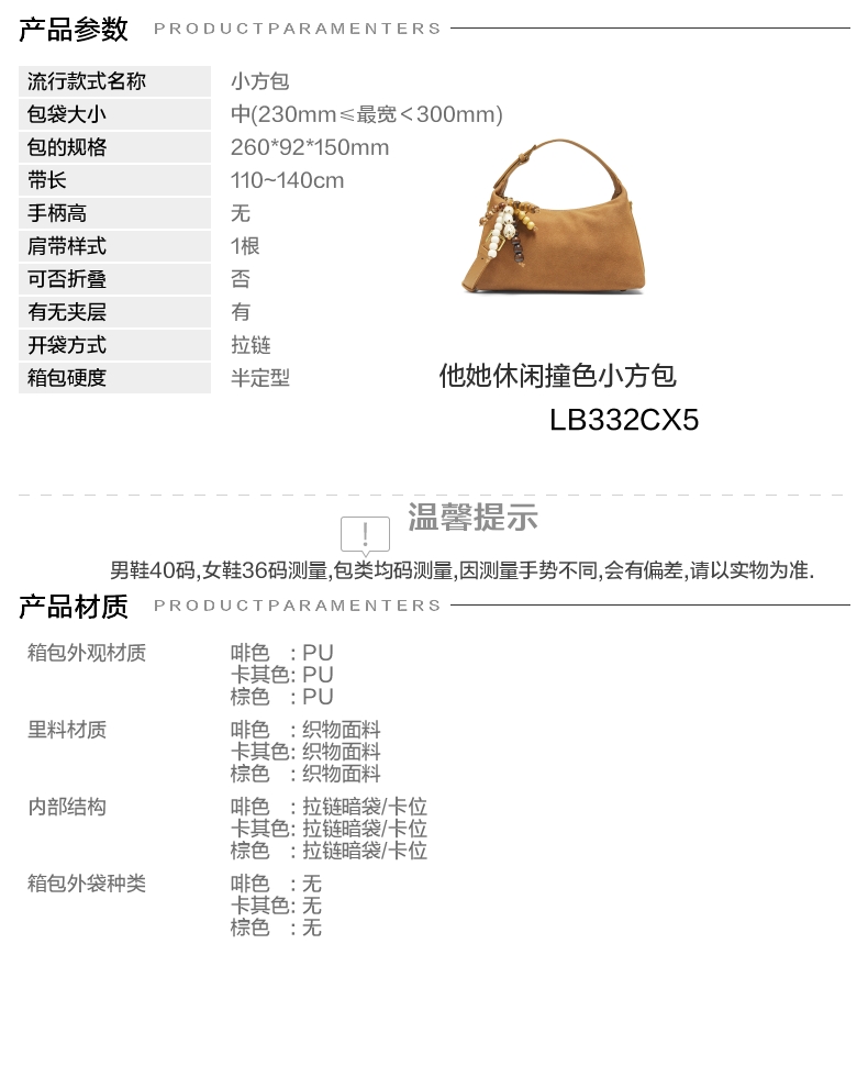 | 包的规格:260*92*150mm | 闭合方式:拉链 | 背带方式:手提/单肩 | 内部结构:拉链暗袋/卡位 | 风格:休闲 |