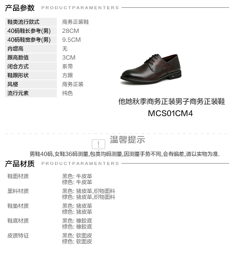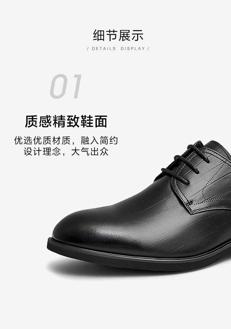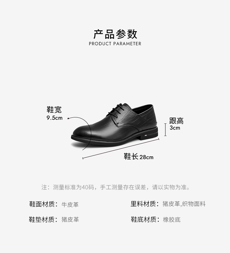 | 风格:商务正装 | 色系:黑色 | 跟高数值:3CM | 40码鞋宽参考(男):9.5CM | 性别:男子 |
