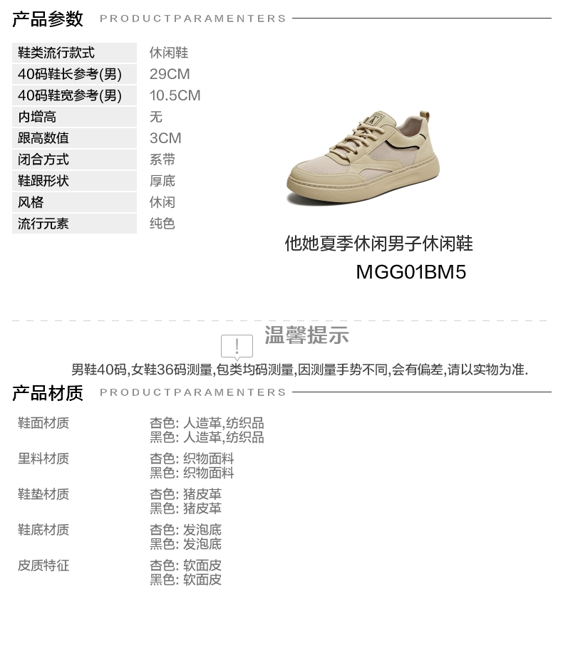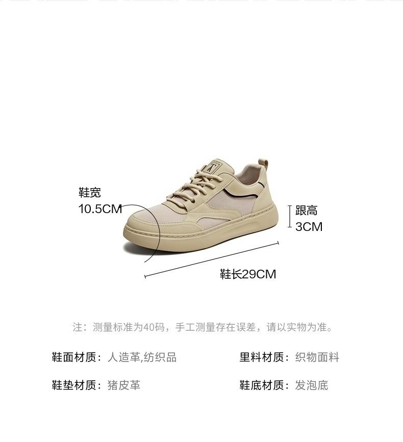 | 风格:休闲 | 色系:杏色 | 跟高数值:3CM | 40码鞋宽参考(男):10.5CM | 性别:男子 |
