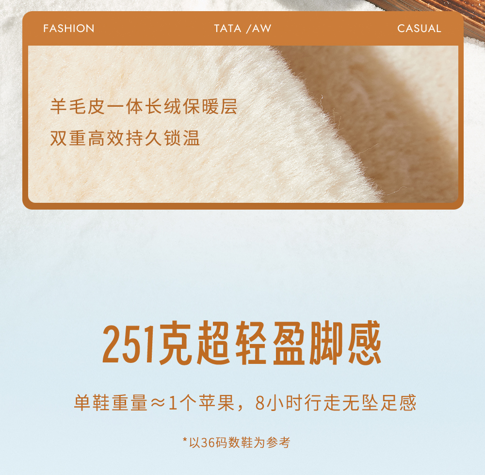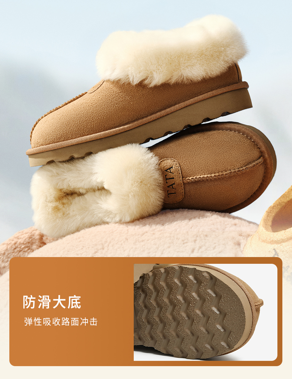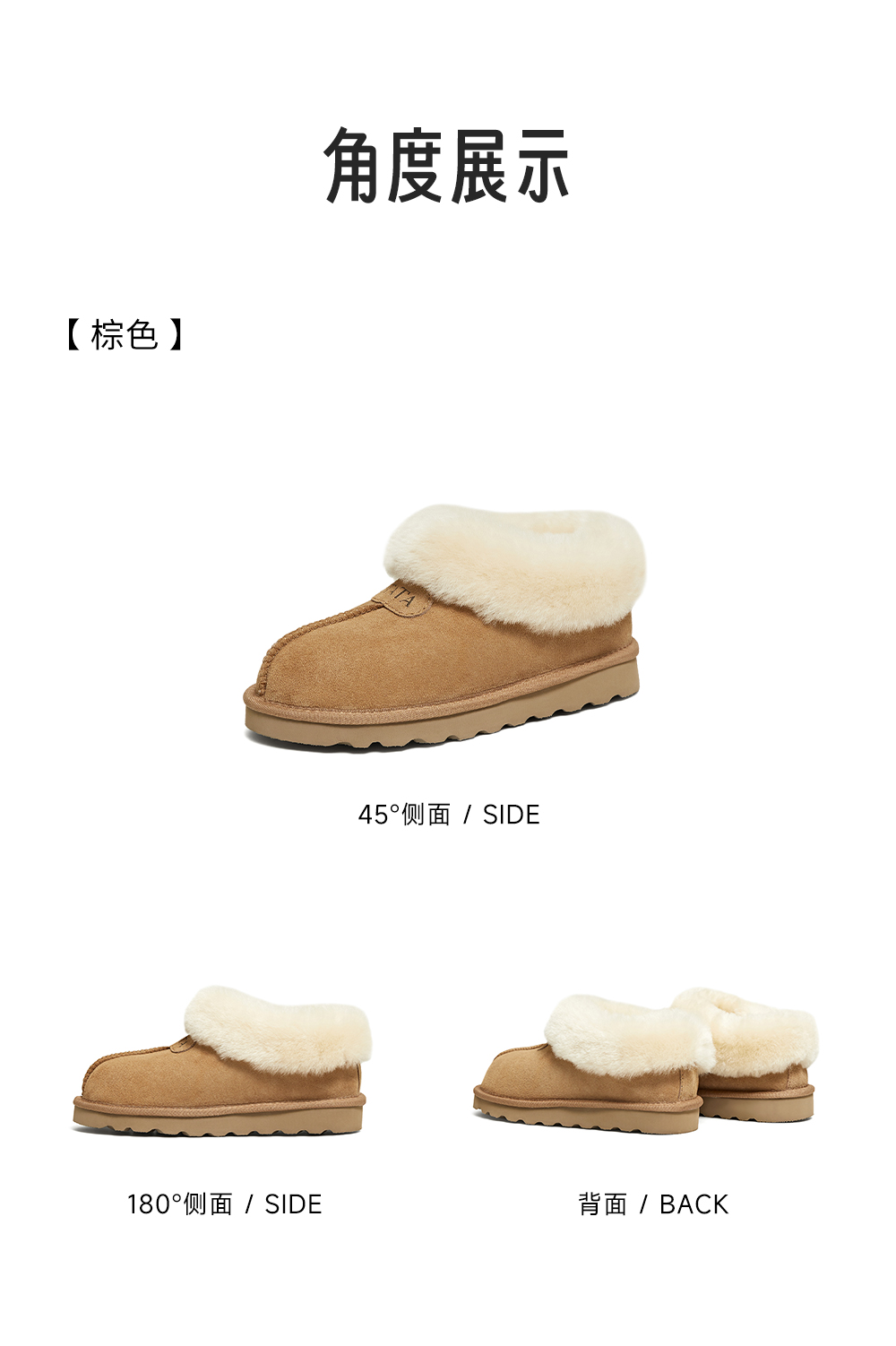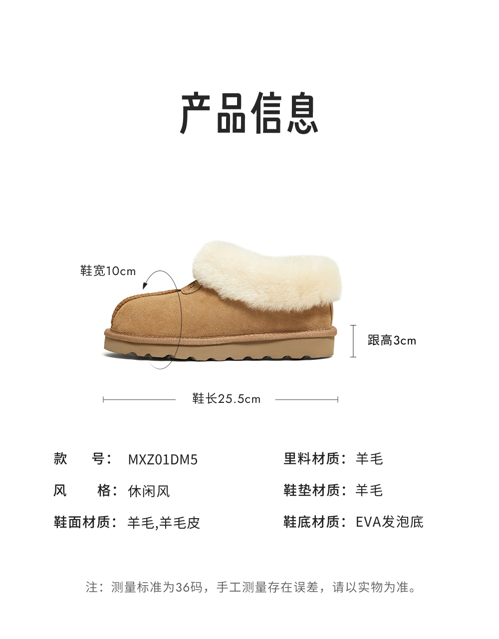 | 鞋帮:低帮 | 鞋底材质:EVA发泡底 | 内增高:无 | 鞋面材质:羊毛羊毛皮 | 闭合方式:套脚 |