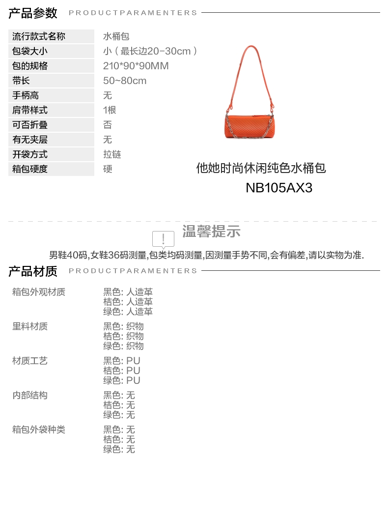 | 包的规格:210*90*90mm | 闭合方式:拉链 | 背带方式:单肩 | 内部结构:无 | 风格:时尚休闲 |