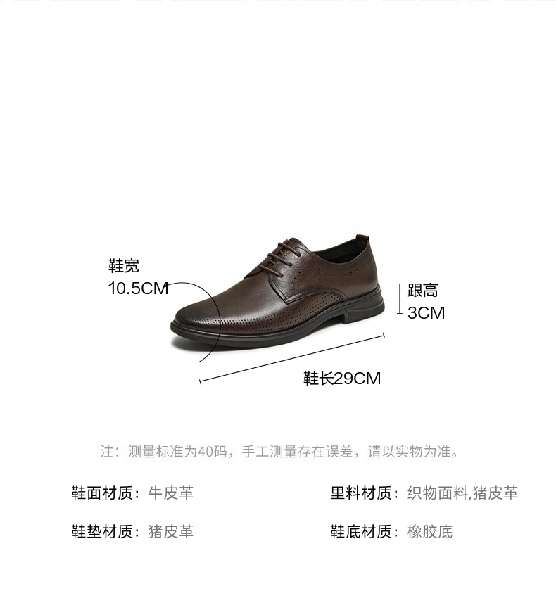 | 色系:棕色 | 跟高数值:3CM | 40码鞋宽参考(男):10.5CM | 性别:男子 | 里料材质:织物面料猪皮革 |