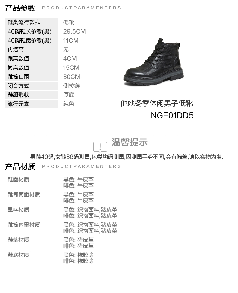 | 闭合方式:侧拉链 | 40码鞋宽参考(男):11CM | 靴筒口围:30CM | 上市时间:2025年冬季 | 鞋类流行款式:低靴 |