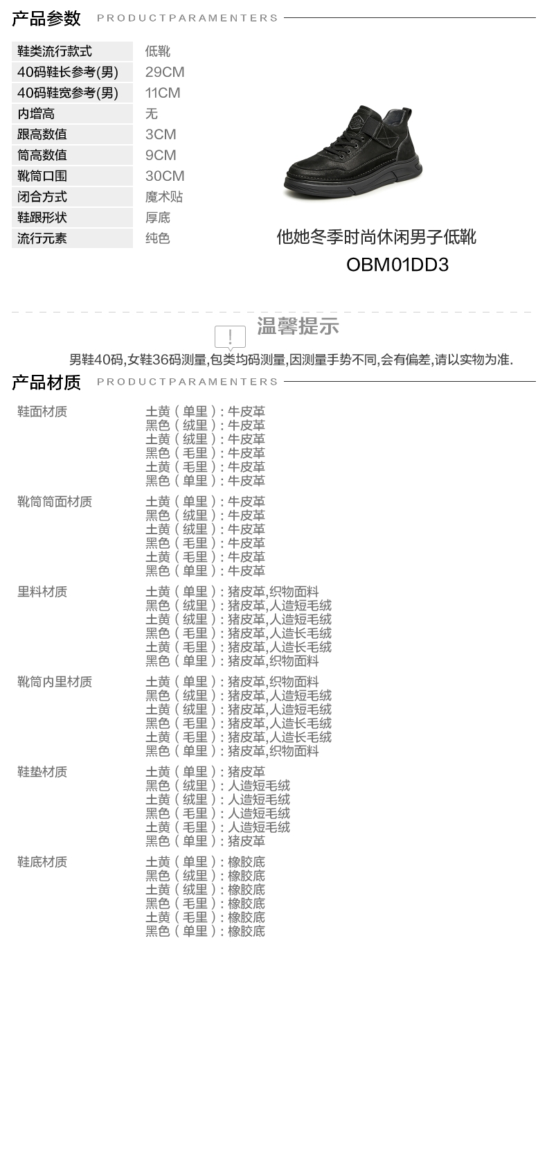 | 闭合方式:魔术贴 | 40码鞋宽参考(男):11.5CM | 靴筒口围:31CM | 上市时间:2024年冬季 | 鞋类流行款式:低靴 |