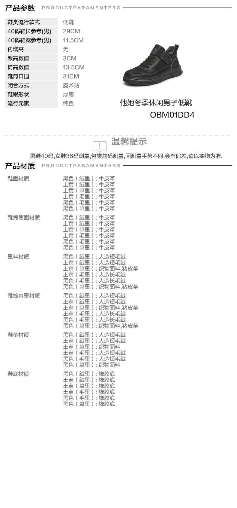 | 闭合方式:魔术贴 | 40码鞋宽参考(男):11.5CM | 靴筒口围:31CM | 上市时间:2024年冬季 | 鞋类流行款式:低靴 |