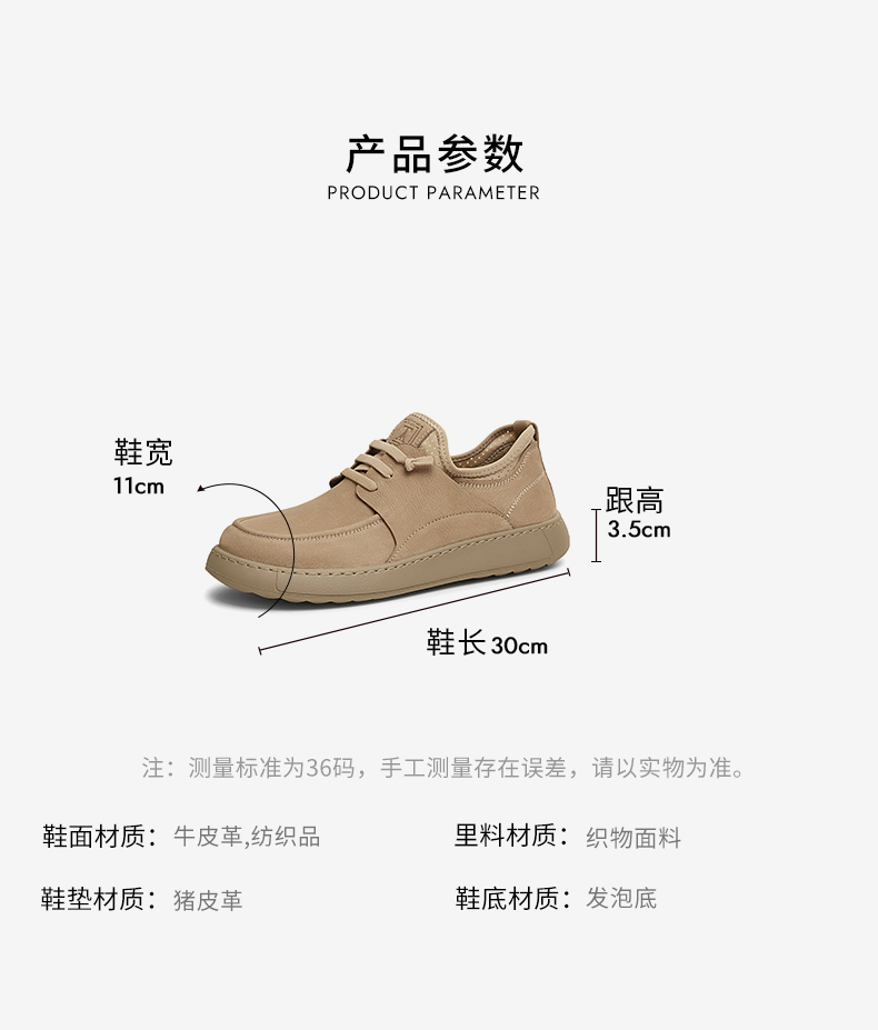 | 内增高:无 | 鞋跟形状:平跟 | 鞋面材质:纺织品牛皮革 | 流行元素:纯色 | 闭合方式:系带 |
