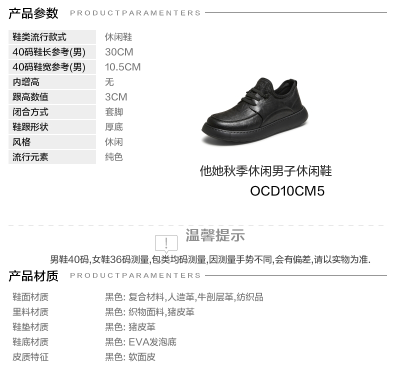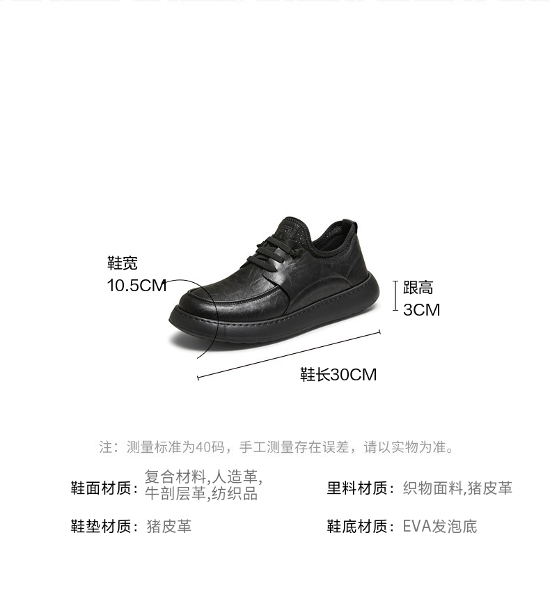 | 风格:休闲 | 色系:黑色 | 跟高数值:3CM | 40码鞋宽参考(男):10.5CM | 性别:男子 |