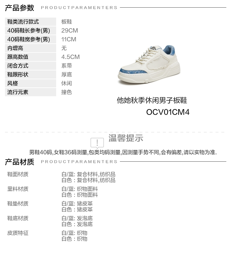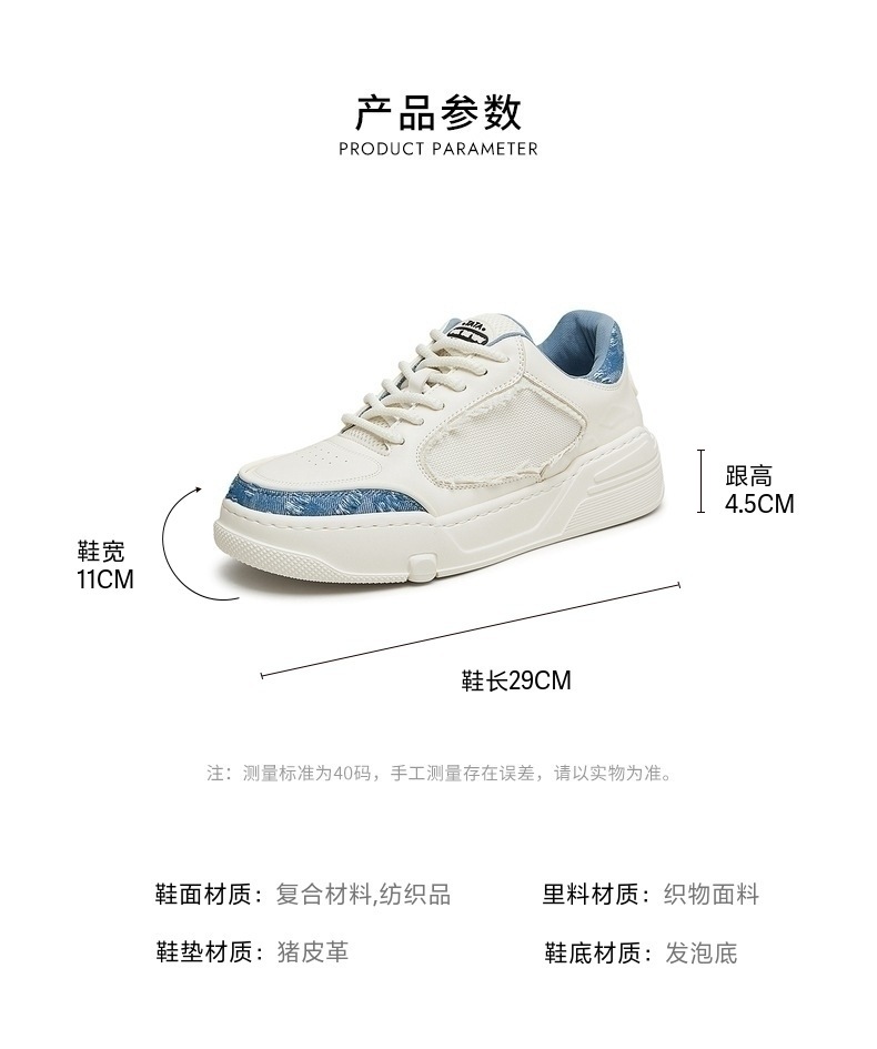 | 风格:休闲 | 色系:白色 | 跟高数值:4.5CM | 40码鞋宽参考(男):11CM | 性别:男子 |