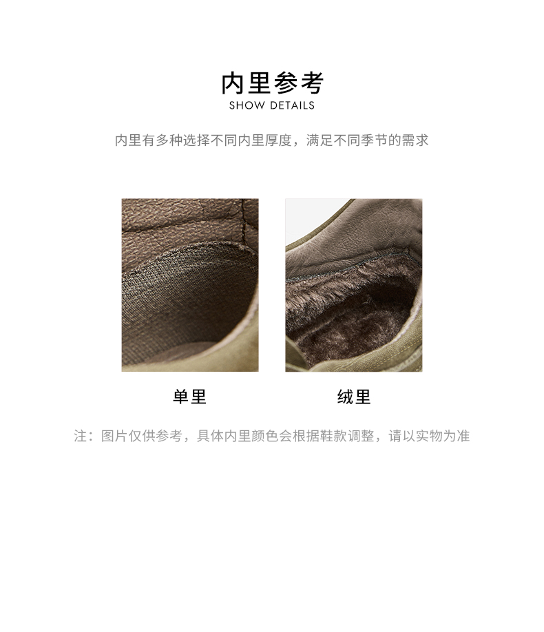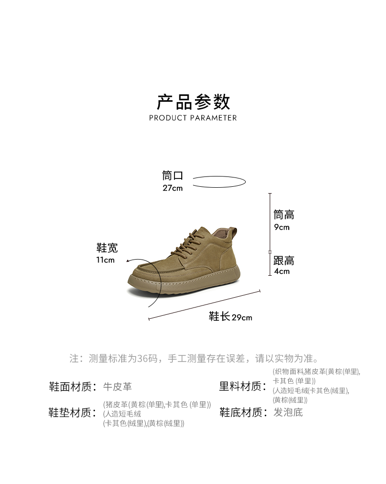 | 筒高数值:9CM | 性别:男子 | 靴筒筒面材质:牛皮革 | 里料材质:人造短毛绒 | 内里:人造短毛绒 |