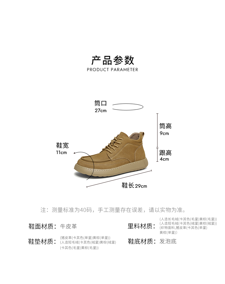 | 筒高数值:8.5CM | 性别:男子 | 靴筒筒面材质:牛皮革 | 里料材质:人造长毛绒 | 内里:人造毛绒 |