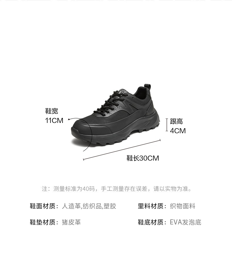| 风格:休闲 | 色系:黑色 | 跟高数值:4CM | 40码鞋宽参考(男):11CM | 性别:男子 |