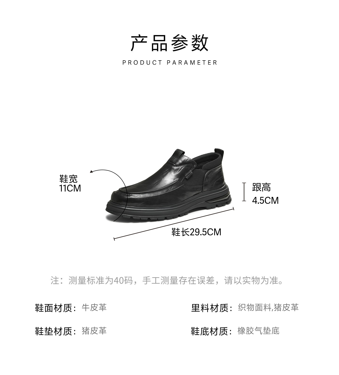 | 风格:休闲 | 色系:黑色 | 跟高数值:4.5CM | 40码鞋宽参考(男):11CM | 性别:男子 |
