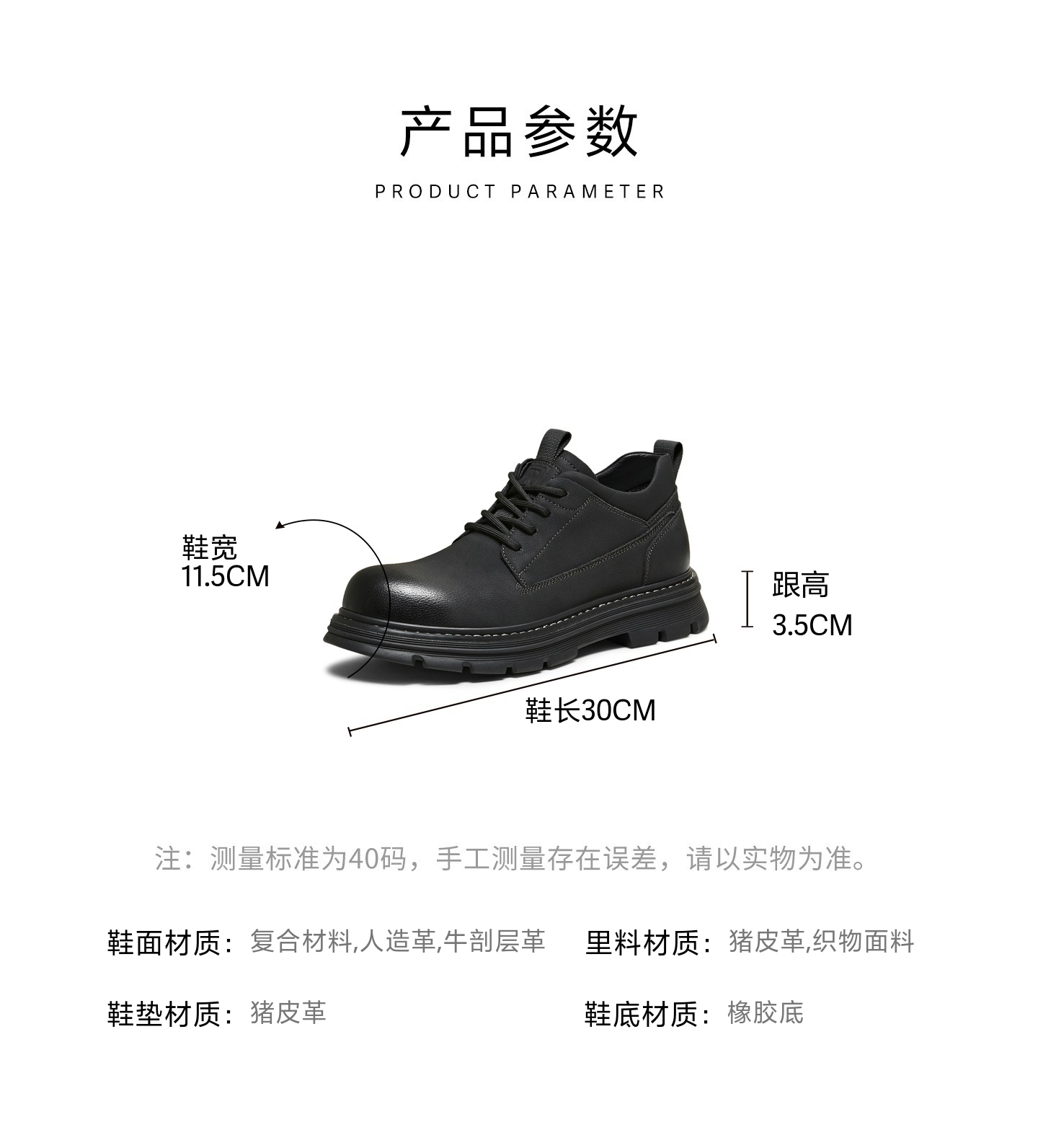 | 风格:休闲 | 色系:黑色 | 跟高数值:3.5CM | 40码鞋宽参考(男):11.5CM | 性别:男子 |
