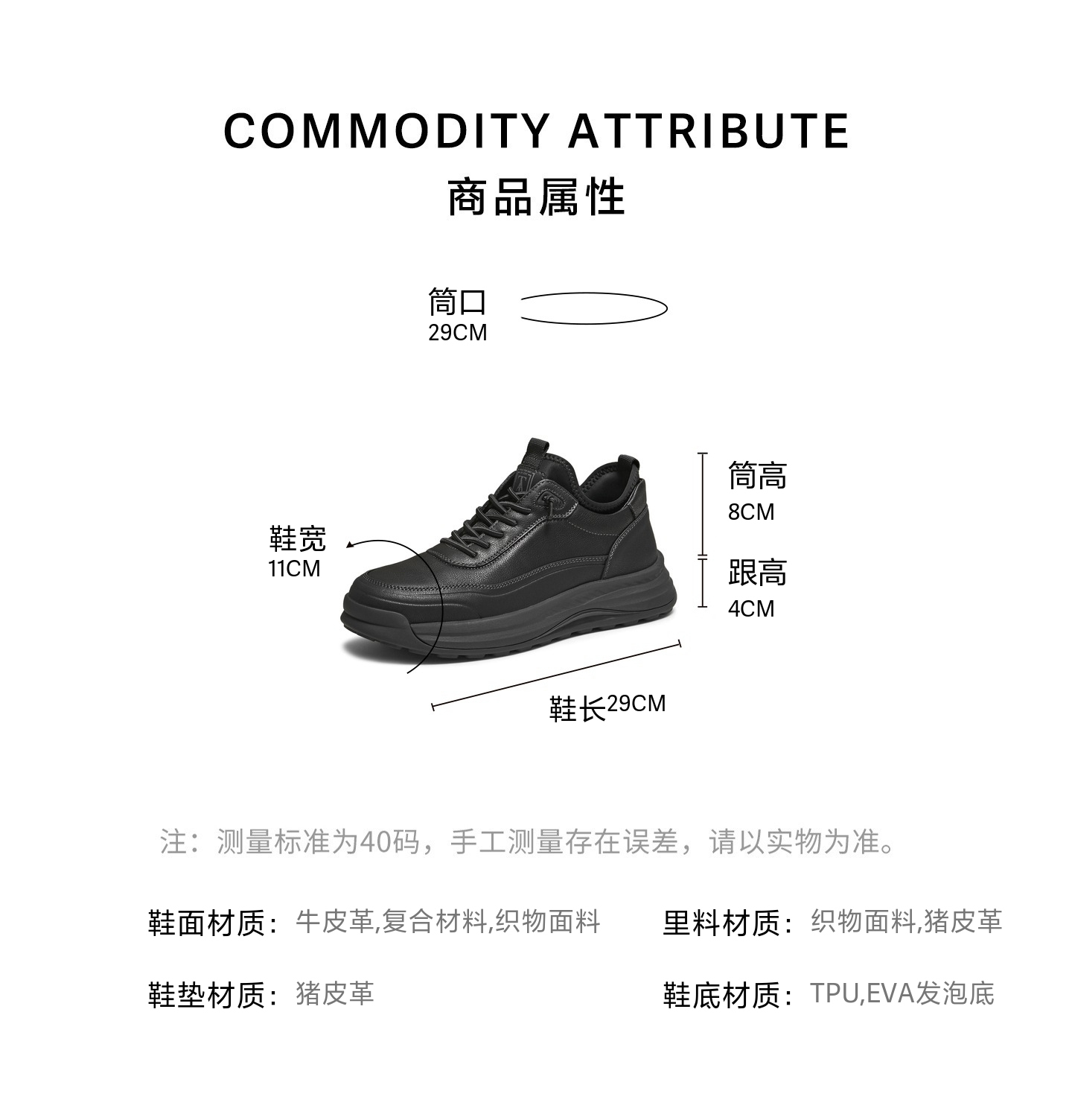 | 跟高数值:4CM | 色系:黑色 | 性别:男子 | 筒高数值:8CM | 靴筒筒面材质:织物面料复合材料牛皮革 |