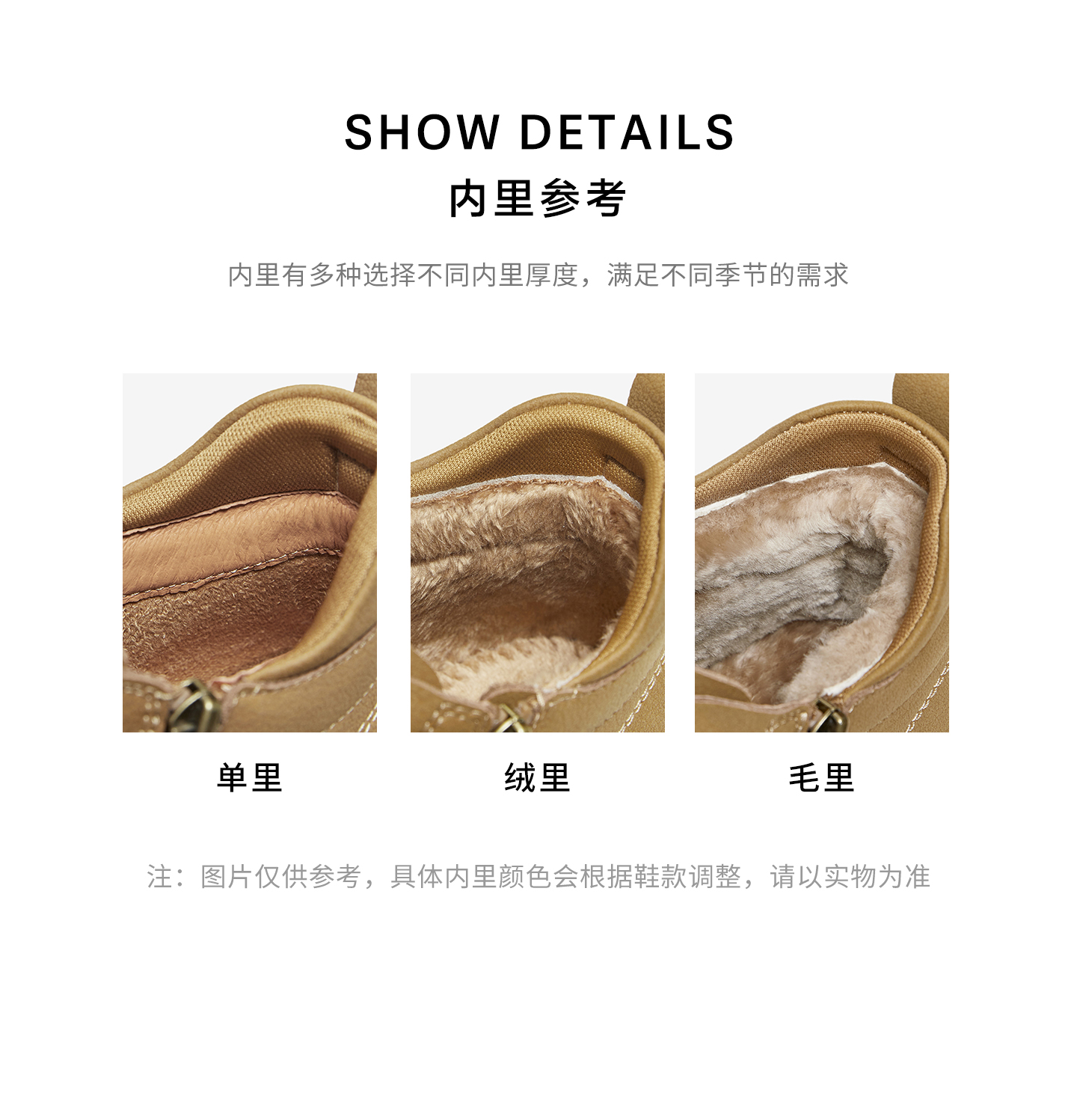 | 闭合方式:系带侧拉链 | 40码鞋宽参考(男):11CM | 靴筒口围:28CM | 上市时间:2025年冬季 | 鞋类流行款式:低靴 |