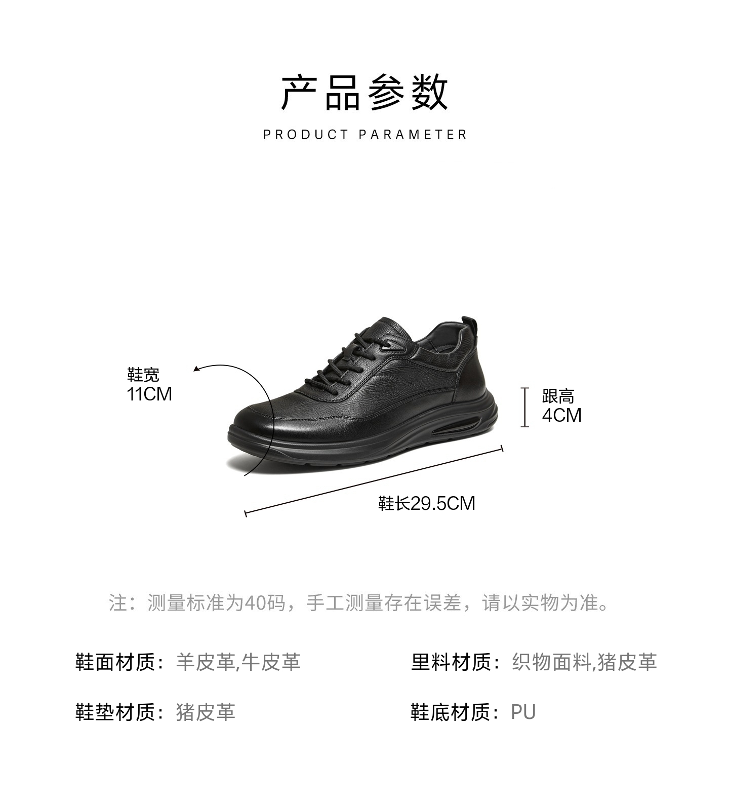 | 40码鞋长参考(男):29.5CM | 鞋帮:低帮 | 鞋头款式:圆头 | 鞋底材质:PU | 鞋面图案:纯色 |