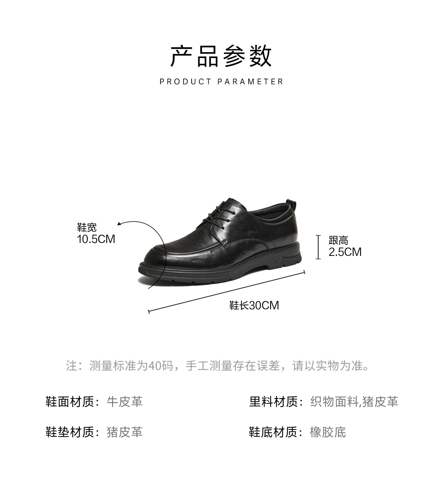 | 风格:休闲 | 鞋面内里材质:猪皮革 | 色系:黑色 | 跟高数值:2.5CM | 40码鞋宽参考(男):10.5CM |