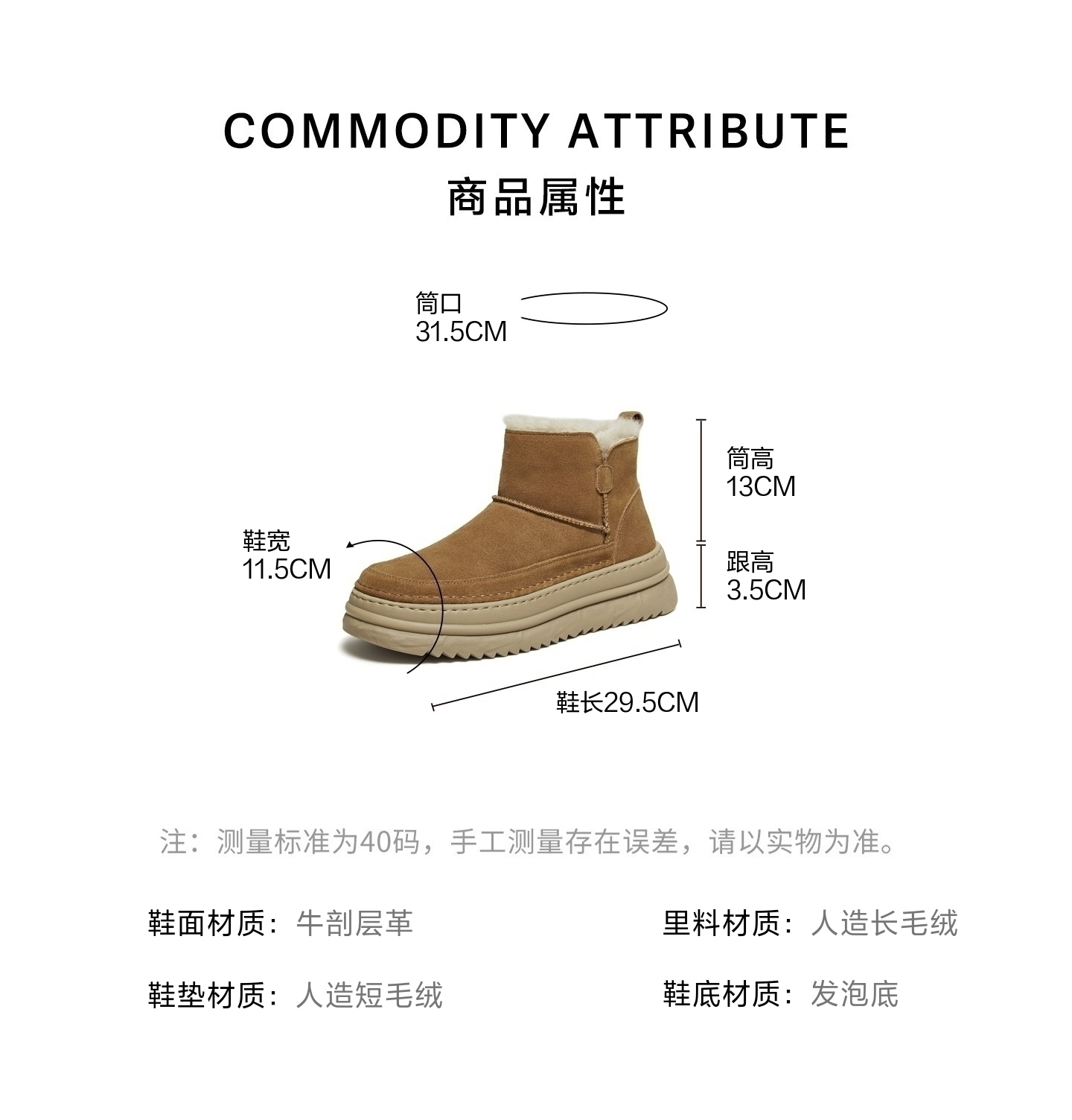 | 40码鞋长参考(男):29.5CM | 鞋底材质:发泡底 | 靴筒内里材质:人造长毛绒 | 内增高:无 | 鞋面材质:牛剖层革 |