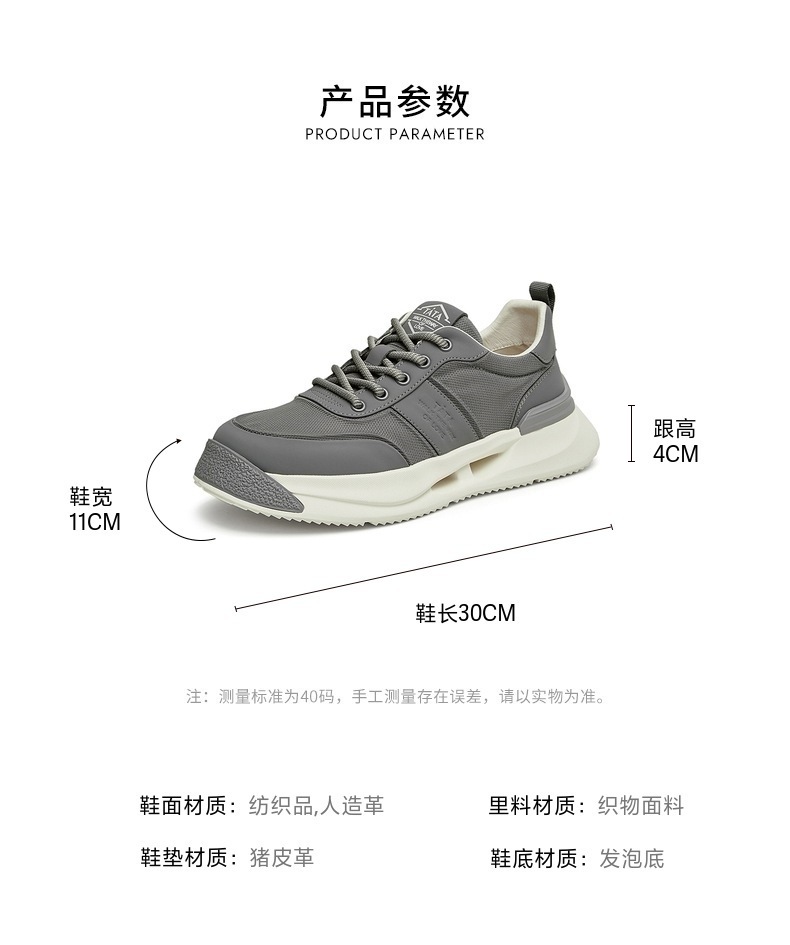 | 风格:休闲 | 色系:黑色 | 跟高数值:4CM | 40码鞋宽参考(男):11CM | 性别:男子 |