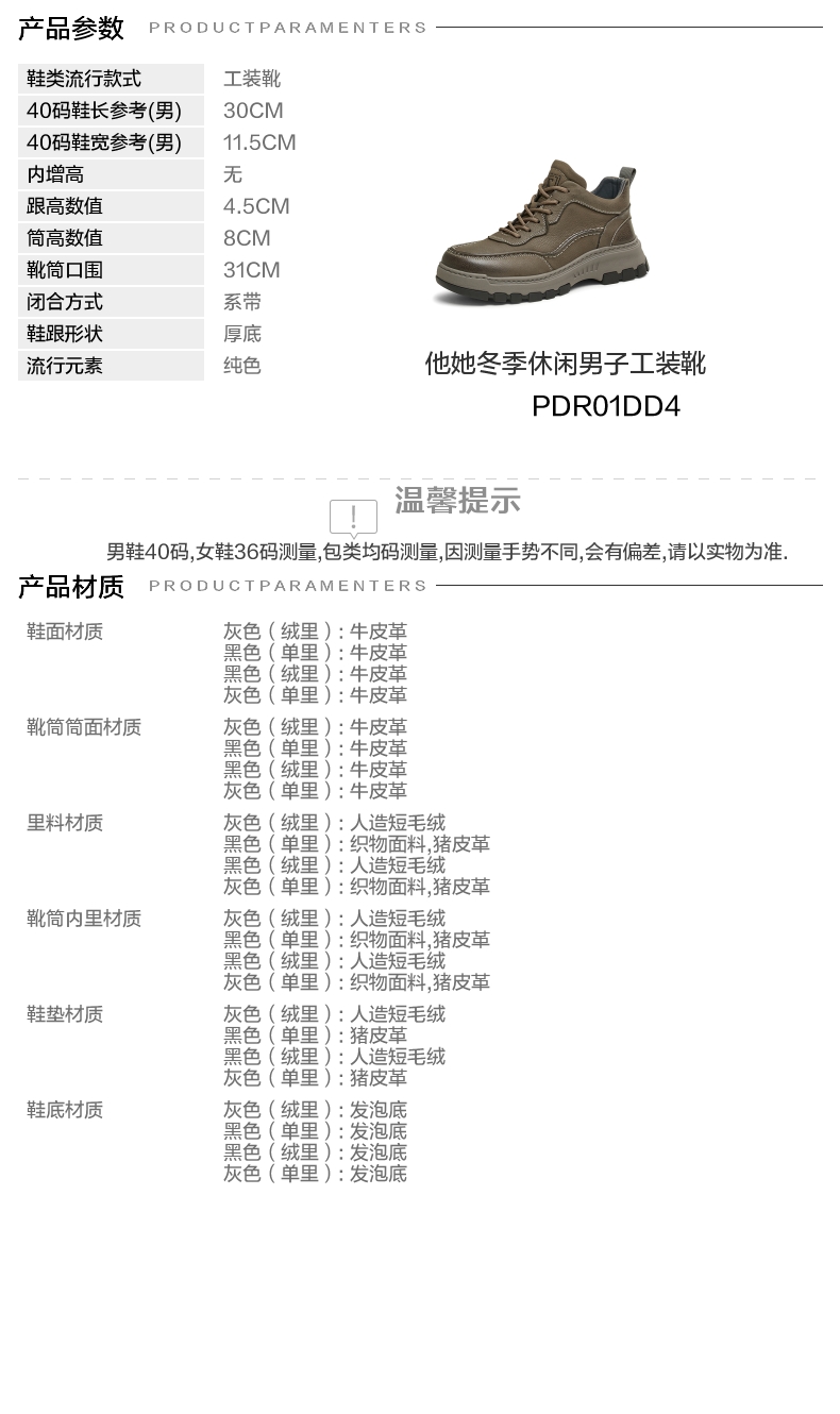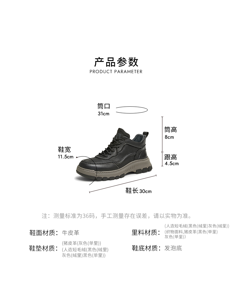 | 40码鞋长参考(男):30CM | 鞋底材质:发泡底 | 靴筒内里材质:猪皮革织物面料 | 内增高:无 | 鞋面材质:牛皮革 |