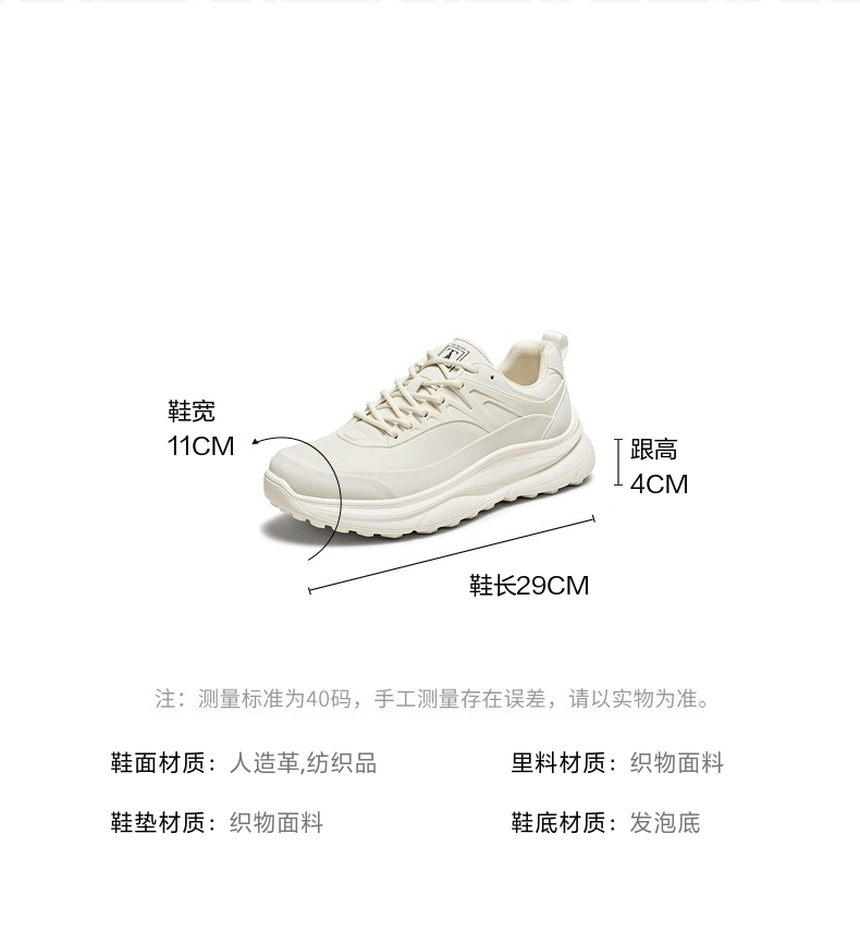 | 风格:休闲 | 色系:白色 | 跟高数值:4CM | 40码鞋宽参考(男):11CM | 性别:男子 |