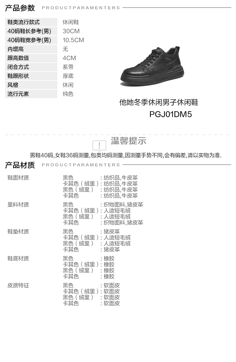 | 风格:休闲 | 色系:黑色 | 跟高数值:4CM | 40码鞋宽参考(男):10.5CM | 性别:男子 |