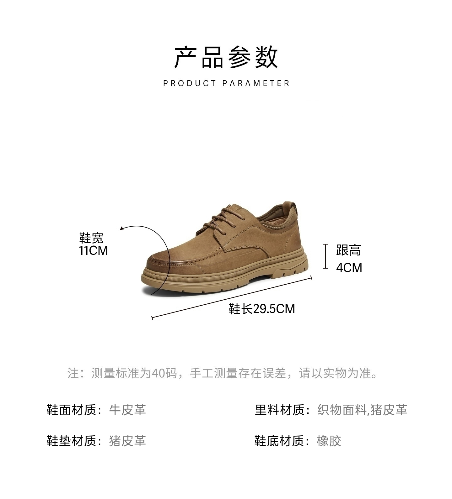 | 风格:休闲 | 色系:卡其 | 跟高数值:4CM | 40码鞋宽参考(男):11CM | 性别:男子 |