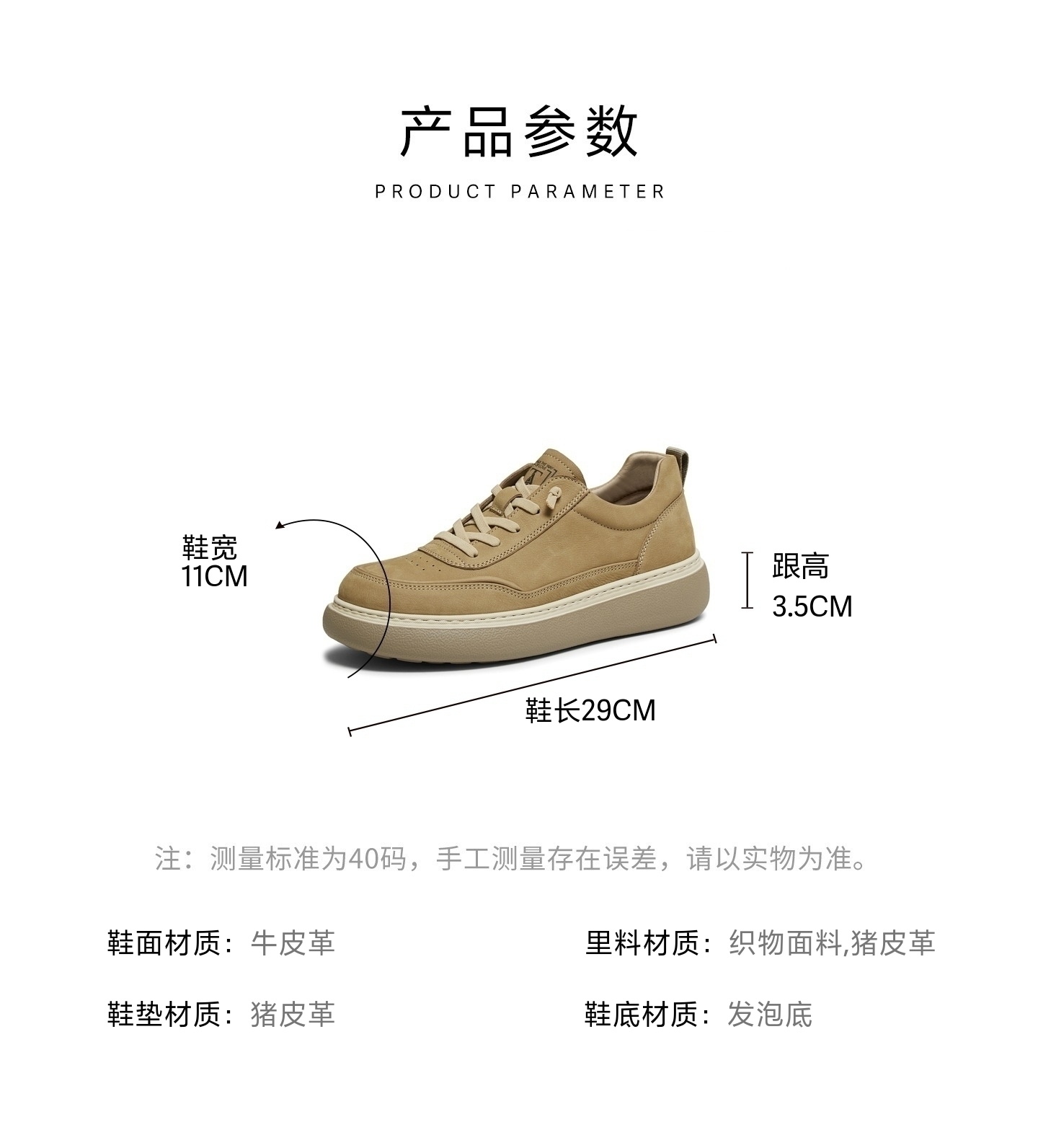 | 风格:休闲 | 色系:卡其 | 跟高数值:3.5CM | 40码鞋宽参考(男):11CM | 性别:男子 |