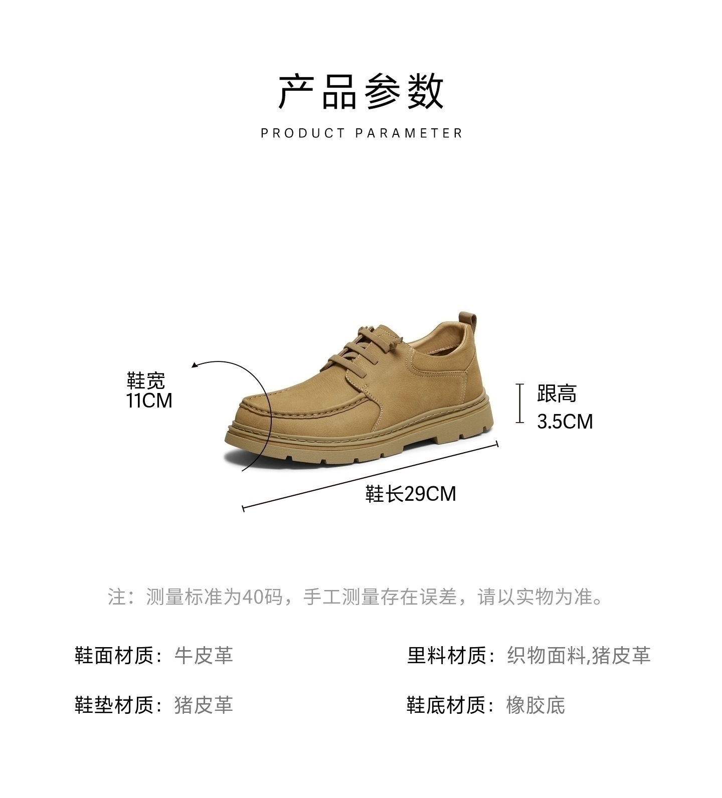 | 风格:休闲 | 色系:棕色 | 跟高数值:3.5CM | 40码鞋宽参考(男):11CM | 性别:男子 |