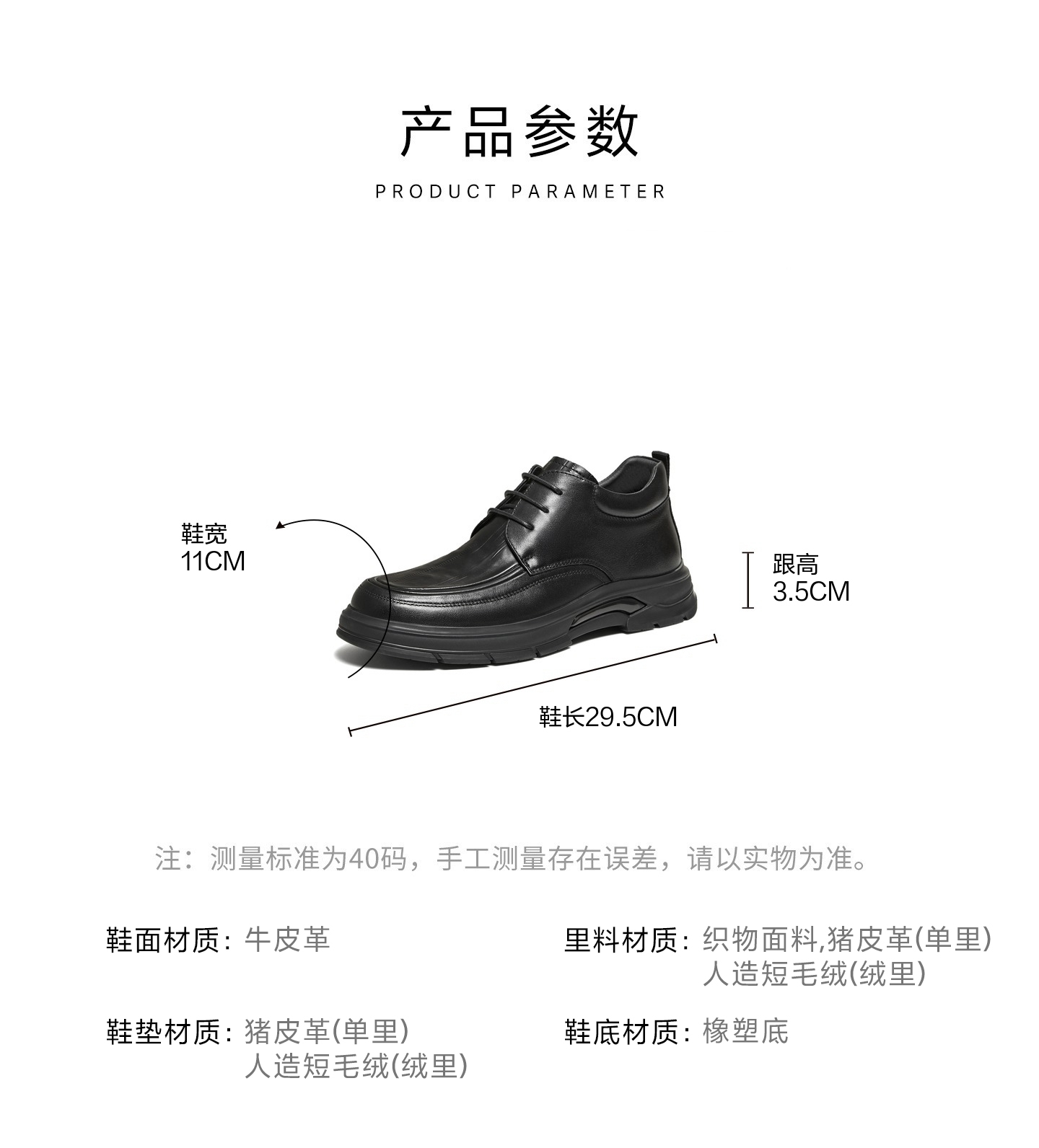 | 40码鞋长参考(男):29.5CM | 鞋底材质:橡胶底 | 靴筒内里材质:人造短毛绒 | 内增高:无 | 鞋面材质:牛皮革 |