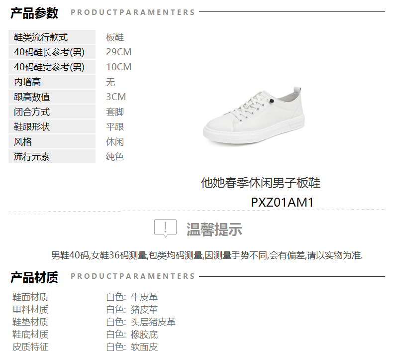 | 色系:白色 | 跟高数值:3CM | 货品来源:外购 | 40码鞋宽参考(男):10CM | 性别:男子 |