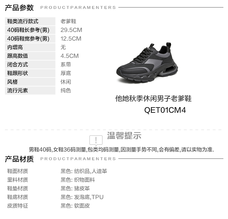 | 流行元素:纯色 | 风格:休闲 | 年份:2024年 | 色系:黑色 | 跟高数值:4.5CM |