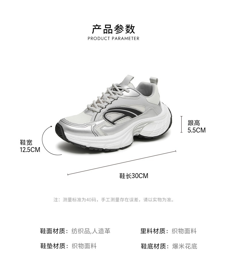 | 内增高:无 | 鞋跟形状:厚底 | 鞋面材质:人造革纺织品 | 流行元素:撞色 | 闭合方式:系带 |